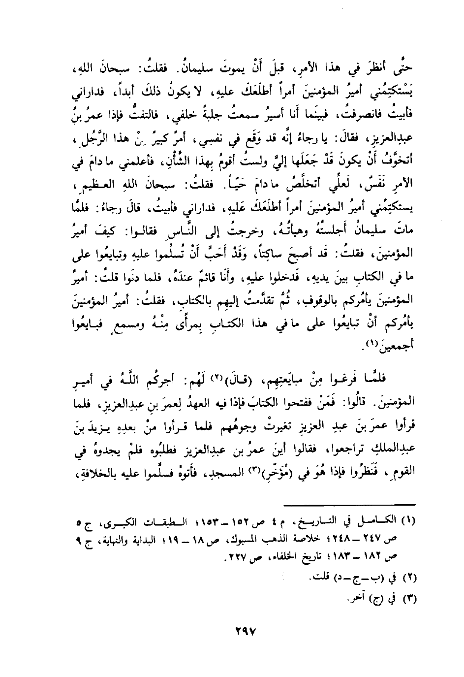 حَتَّى أنظر فِي هَذَا الْأَمر قبل أَن يَمُوت سُلَيْمَان فَقلت سُبْحَانَ الله يستكتمني أَمِير الْمُؤمنِينَ أمرا أطلعك عَلَيْهِ لَا يكون ذَلِك أبدا فداراني فأبيت فَانْصَرَفت فَبَيْنَمَا أَنا أَسِير سَمِعت جلبة خَلْفي فَالْتَفت فَإِذا عمر بن عبد الْعَزِيز فَقَالَ يَا رَجَاء إِنَّه قد وَقع فِي نَفسِي أَمر كَبِير فِي هَذَا الرجل أَتَخَوَّف أَن يكون قد جعلهَا إِلَيّ وَلست أقوم بِهَذَا الشَّأْن فَأَعْلمنِي مَا دَامَ فِي الْأَمر نفس لعَلي أتخلص مَا دَامَ حَيا فَقلت سُبْحَانَ الله الْعَظِيم يستكتمني أَمِير الْمُؤمنِينَ أمرا أطلعك عَلَيْهِ فداراني فأبيت قَالَ رَجَاء فَلَمَّا مَاتَ سُلَيْمَان أجلسته وهيأته وَخرجت إِلَى النَّاس فَقَالُوا كَيفَ أَمِير الْمُؤمنِينَ فَقلت قد أصبح ساكتا وَقد أحب أَن تسلموا عَلَيْهِ وتبايعوا على مَا فِي الْكتاب بَين يَدَيْهِ فَدَخَلُوا عَلَيْهِ وَأَنا قَائِم عِنْده فَلَمَّا دنو قلت أَمِير الْمُؤمنِينَ يَأْمُركُمْ بِالْوُقُوفِ ثمَّ تقدّمت إِلَيْهِم بِالْكتاب فَقلت أَمِير الْمُؤمنِينَ يَأْمُركُمْ أَن تبايعوا على مَا فِي هَذَا الْكتاب بمرأى مِنْهُ ومسمع فَبَايعُوا أَجْمَعِينَ