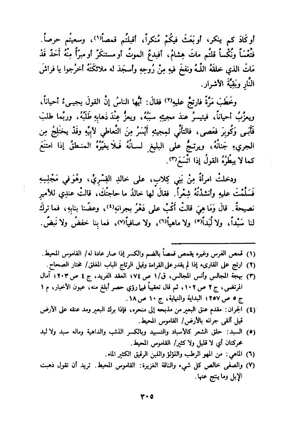 وَدخلت امْرَأَة من بني كلاب على خَالِد الْقَسرِي وَهُوَ فِي مَجْلِسه فَسلمت عَلَيْهِ وأنشدته شعرًا فَقَالَ لَهَا خَالِد مَا حَاجَتك قَالَت عِنْدِي للأمير نصيحة قَالَ وَمَا هِيَ قَالَت أكب على دهر بجرانه وعضنا بنابه فَمَا ترك لنا سيدا وَلَا لبدا وَلَا ماهيا وَلَا صافيا فَمَا بِنَا خفض وَلَا نبض
