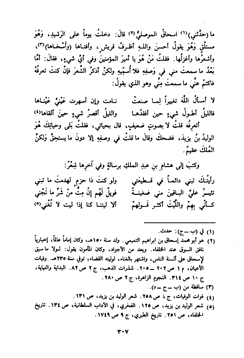 مَا حَدثنِي إِسْحَاق الْموصِلِي قَالَ دخلت يَوْمًا على الرشيد وَهُوَ مستلق وَهُوَ يَقُول أحسن وَالله أظرف قُرَيْش وأفتاها وأسخاها وأشعرها وأغزلها فَقلت من هُوَ يَا أَمِير الْمُؤمنِينَ وَفِي أَي شَيْء فَقَالَ أما بعد مَا سَمِعت مني فِي وَصفه فَلَا أُسَمِّيهِ وَلَكِن أذكر الشّعْر فَإِن كنت تعرفه فاكتم عني مَا سَمِعت مني وَهُوَ الَّذِي يَقُول