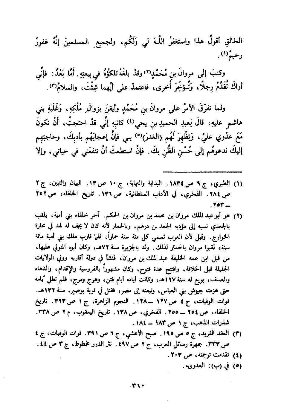 وَكتب إِلَى مَرْوَان بن مُحَمَّد وَقد بلغه تلكؤه فِي بيعَته أما بعد فَإِنِّي أَرَاك تقدم رجلا وتؤخر أُخْرَى فاعتمد على أَيهمَا شِئْت وَالسَّلَام