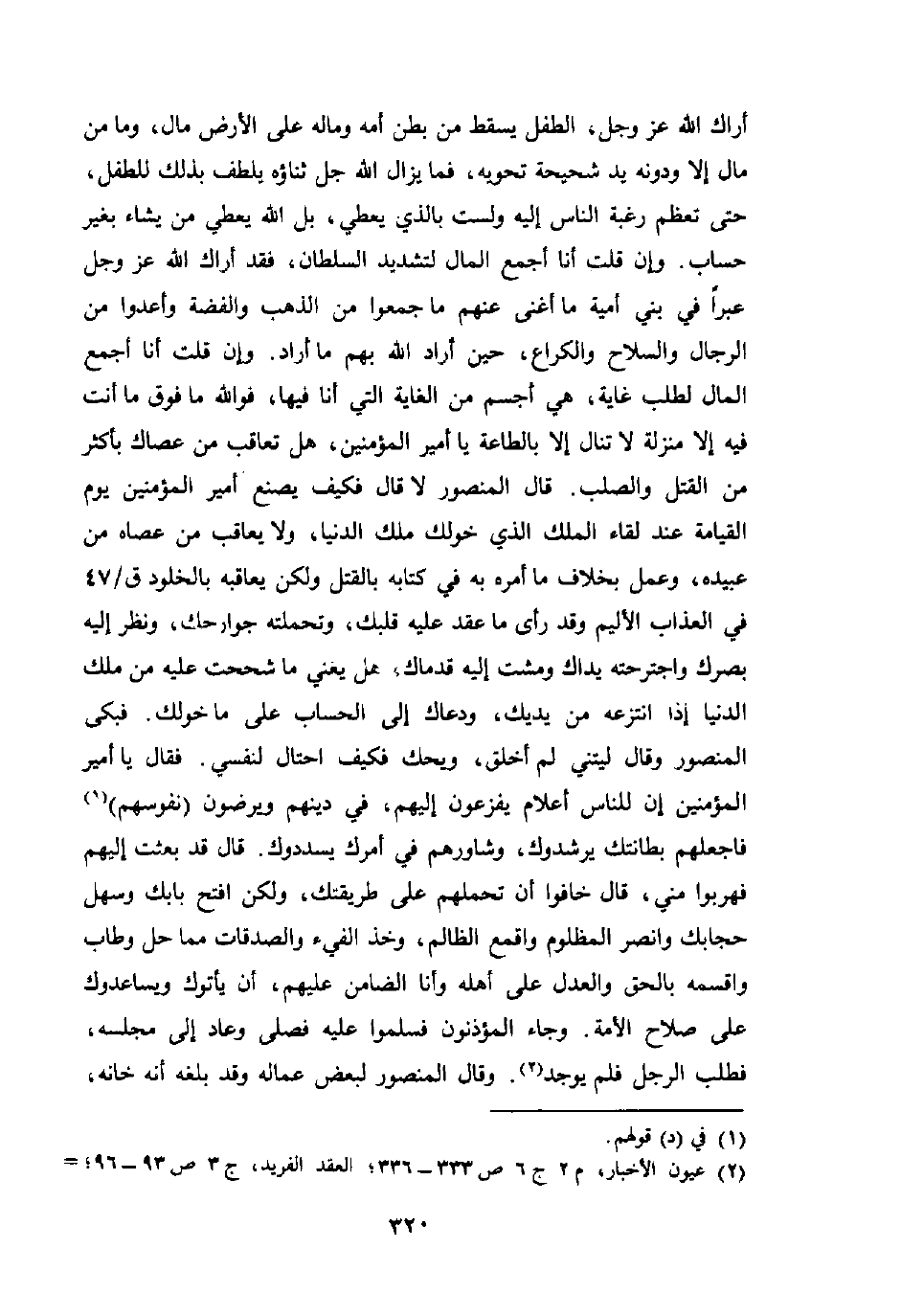 أَرَاك الله عز وَجل الطِّفْل يسْقط من بطن أمه وَمَاله على الأَرْض مَال وَمَا من مَال إِلَّا ودونه يَد شحيحة تحويه فَمَا يزَال الله عز وَجل ثَنَاؤُهُ يلطف بذلك الطِّفْل حَتَّى تعظم رَغْبَة النَّاس إِلَيْهِ وَلست بِالَّذِي يُعْطي بل الله يُعْطي من يَشَاء بِغَيْر حِسَاب وَإِن قلت أَنا أجمع المَال لتشديد السُّلْطَان فقد أَرَاك الله عز وَجل عبرا فِي بني أُميَّة مَا أغْنى عَنْهُم مَا جمعُوا من الذَّهَب وَالْفِضَّة وَأَعدُّوا من الرِّجَال وَالسِّلَاح الكراع حِين أَرَادَ الله بهم مَا أَرَادَ وَإِن قلت أَنا أجمع المَال لطلب غَايَة هِيَ أجسم من الْغَايَة الَّتِي أَنا فِيهَا فوَاللَّه مَا فَوق مَا أَنْت فِيهِ إِلَّا منزلَة لَا تنَال إِلَّا بِالطَّاعَةِ يَا أَمِير الْمُؤمنِينَ هَل تعاقب من عصاك بِغَيْر بِأَكْثَرَ من الْقَتْل والصلب قَالَ الْمَنْصُور لَا قَالَ فَكيف يصنع أَمِير الْمُؤمنِينَ يَوْم الْقِيَامَة عِنْد لِقَاء الْملك الَّذِي خولك ملك الدُّنْيَا وَلَا يُعَاقب من عَصَاهُ من عبيده وَعمل بِخِلَاف مَا أَمر بِهِ فِي كِتَابه بِالْقَتْلِ وَلَكِن يُعَاقِبهُ فِي الخلود ق 47 فِي الْعَذَاب الْأَلِيم وَقد رأى مَا عقد عَلَيْهِ قَلْبك وتحملته جوارحك وَنظر إِلَيْهِ بَصرك واجترحته يداك ومشت إِلَيْهِ قدماك عمل يُغني مَا شححت عَلَيْهِ من ملك الدُّنْيَا إِذا انتزعه من يَديك ودعاك إِلَى الْحساب على مَا خولك فَبكى الْمَنْصُور وَقَالَ يَا لَيْتَني لم أخلق وَيحك فَكيف أحتال لنَفْسي فَقَالَ يَا أَمِير الْمُؤمنِينَ إِن للنَّاس أَعْلَام يفزعون إِلَيْهِم فِي دينهم ويرضون نُفُوسهم فاجعلهم بطانتك يرشدوك وشاورهم فِي أَمرك يسددوك قَالَ قد بعثت إِلَيْهِم فَهَرَبُوا مني قَالَ خَافُوا أَن تحملهم على طريقتك وَلَكِن افْتَحْ بابك وَسَهل حجابك وانصر الْمَظْلُوم واقمع الظَّالِم وَخذ الْفَيْء وَالصَّدقَات مِمَّا حل وطاب واقسمه بِالْحَقِّ وَالْعدْل على أَهله وَأَنا الضَّامِن عَلَيْهِم أَن يأتوك ويساعدوك على صَلَاح الْأمة وَجَاء المؤذنون فَسَلمُوا عَلَيْهِ فصلى وَعَاد إِلَى مَجْلِسه فَطلب الرجل فَلم يُوجد وَقَالَ الْمَنْصُور لبَعض عماله وَقد بلغه أَنه خانه