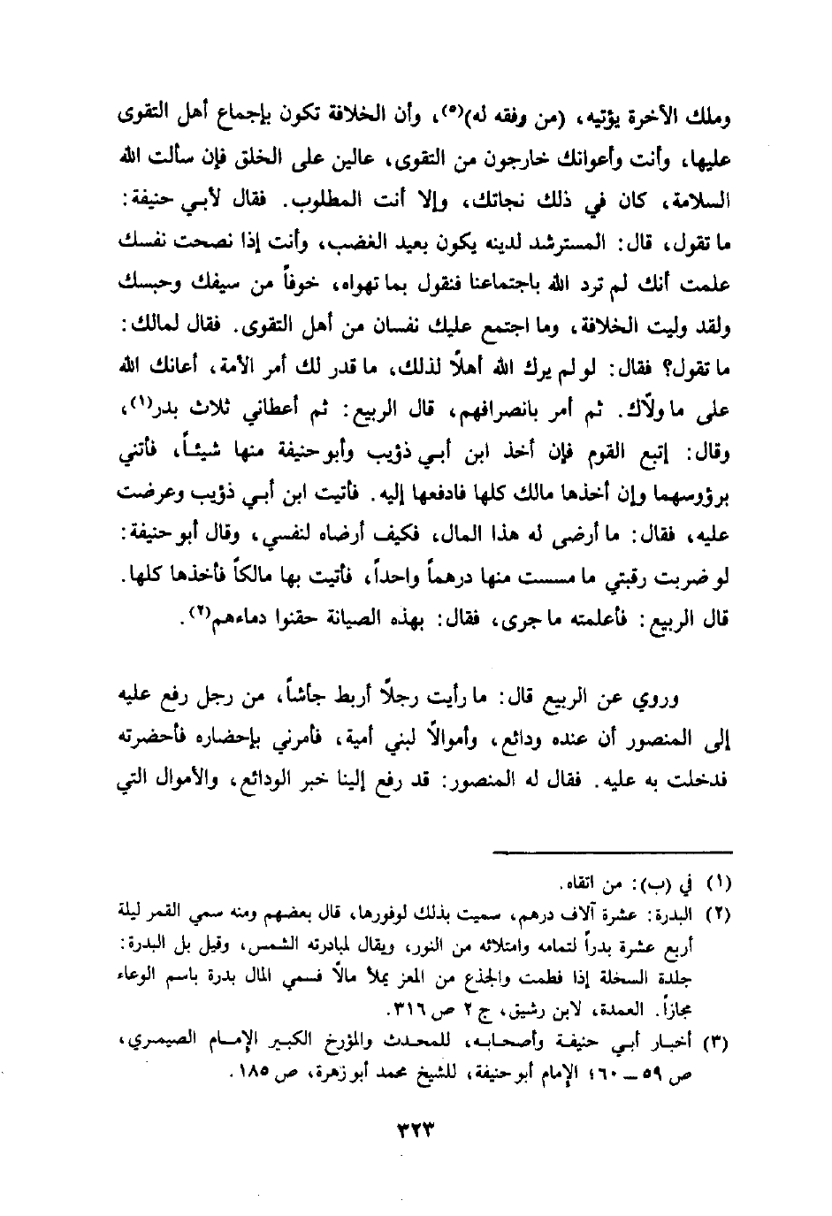 وَملك الْآخِرَة يؤتيه من وَفقه لَهُ وَإِن الْخلَافَة تكون بِإِجْمَاع أهل التَّقْوَى عَلَيْهَا وَأَنت وأعوانك خارجون من التَّقْوَى عالين على الْخلق فَإِن سَأَلت الله السَّلامَة كَانَ فِي ذَلِك نجاتك وَإِلَّا أَنْت الْمَطْلُوب فَقَالَ لأبي حنيفَة مَا تَقول قَالَ المسترشد لدينِهِ يكون بعيد الْغَضَب وَأَنت إِذا نصحت نَفسك علمت أَنَّك لم ترد الله باجتماعنا فَنَقُول بِمَا تهواه خوفًا من سَيْفك وحبسك وَقد وليت الْخلَافَة وَمَا اجْتمع عَلَيْك نفسان من أهل التَّقْوَى فَقَالَ لمَالِك مَا تَقول فَقَالَ لَو لم يَرك الله أَهلا لذَلِك مَا قدر لَك أَمر الْأمة أعانك الله على مَا ولاك ثمَّ أَمر بانصرافهم قَالَ الرّبيع ثمَّ أَعْطَانِي ثَلَاث بدر وَقَالَ اتبع الْقَوْم فَإِن أَخذ ابْن أبي ذُؤَيْب وَأَبُو حنيفَة مِنْهَا شَيْئا فأتني برؤوسهما وَإِن أَخذهَا مَالك كلهَا فادفعها إِلَيْهِ فَأتيت ابْن أبي ذُؤَيْب وَعرضت عَلَيْهِ فَقَالَ مَا أرْضى لَهُ هَذَا المَال فَكيف أرضاه لنَفْسي وَقَالَ أَبُو حنيفَة لَو ضربت رقبتي مَا مسست مِنْهَا درهما وَاحِدًا فَأتيت بهَا مَالِكًا فَأَخذهَا كلهَا قَالَ الرّبيع فأعلمته مَا جرى فَقَالَ بِهَذِهِ الصيانة حقنوا دِمَاءَهُمْ