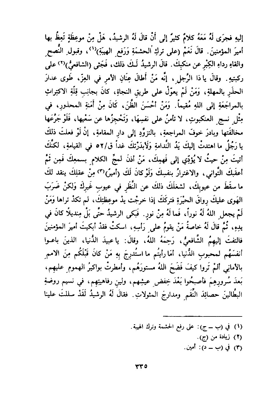 إِلَيْهِ فَجرى لَهُ مَعَه كَلَام كثير إِلَى أَن قَالَ الرشيد هَل من موعظة تعظ بهَا أَمِير الْمُؤمنِينَ قَالَ نعم على ترك الحشمة وَرفع الهيبة وَقبُول النصح وإلقاء رِدَاء الْكبر عَن منكبك قَالَ الرشيد لَك ذَلِك فجثى الشَّافِعِي على رُكْبَتَيْهِ وَقَالَ يَا ذَا الرجل إِنَّه من أَطَالَ عنان الْأَمر فِي الْعِزّ طوى عدار الحذر بالمهلة وَمن لم يعول على طَرِيق النجَاة كَانَ بِجَانِب قلَّة الاكتراث بالمرجعة إِلَى الله مُقيما وَمن أحسن الظَّن كَانَ من أَمنه الْمَحْذُور فِي مثل نسج العنكبوت لَا تأمن على نَفسهَا وتحجزها عَن سعيها فَلَو جرعها مخالفتها وبادر خوف الْمُرَاجَعَة بالتزود إِلَى دَار المقامة إِن لَو فعلت ذَلِك يَا رجل مَا اهتدت إِلَيْك يَد الندامة ولأبدرتك غَدا ق 52 فِي الْقِيَامَة لكنك أتيت من حَيْثُ لَا يُؤَدِّي إِلَى فهمك من أذن لمج الْكَلَام بسمعك فَمن ثمَّ أعقبك التواني والاغترار بِنَفْسِك وَلَو كَانَ لَك أَمِير من عقلك ينْقد لَك مَا سقط من عيونك لشغلك ذَلِك عَن النّظر فِي عُيُوب غَيْرك وَلَكِن ضرب الْهوى عَلَيْك رواق الْحيرَة فتركك إِذا خرجت يَد موعظتك لم تكد ترَاهَا وَمن لم يَجْعَل الله لَهُ نورا فَمَا لَهُ من نور فَبكى الرشيد حَتَّى بل منديلا كَانَ فِي يَده ثمَّ قَالَ لَهُ خَاصَّة من يقوم على رَأسه اسْكُتْ فقد أبكيت أَمِير الْمُؤمنِينَ فَالْتَفت إِلَيْهِ الشَّافِعِي رَحمَه الله وَقَالَ يَا عبيد الدُّنْيَا الَّذين باعوا أنفسهم لمحبوب الدُّنْيَا أما رَأَيْتُمْ مَا استدرج بِهِ من كَانَ قبلكُمْ من الْأُمَم بالأماني ألم تروا كَيفَ فَضَح الله مستورهم وأمطرت بواكير الهموم عَلَيْهِم بعد سرورهم فَأَصْبحُوا بعد خفض عيشهم ولين رفاهيتهم فِي نسيم رَوْضَة البطالين حصائد النقم ومدارج المثولات فَقَالَ لَهُ الرشيد لقد سللت علينا