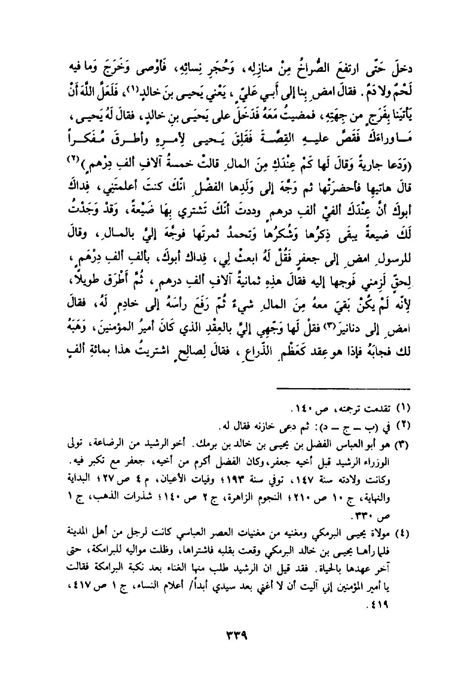 دخل حَتَّى ارْتَفع الصُّرَاخ من مَنَازِله وَحجر نِسَائِهِ فأوصى وَخرج وَمَا فِيهِ لحم وَلَا دم فَقَالَ امْضِ بِنَا إِلَى أبي عَليّ يَعْنِي يحي بن خَالِد فَلَعَلَّ الله أَن يأتينا بفرج من جِهَته فمضيت مَعَه فَدخل على يحي بن خَالِد فَقَالَ لَهُ يحي مَا وَرَاءَك فَقص عَلَيْهِ الْقِصَّة فقلق يحي لأَمره وأطرق مفكرا ودعا جَارِيَة وَقَالَ لَهَا كم عنْدك من المَال قَالَت خَمْسَة آلَاف دِرْهَم قَالَ هاتيها فأحضرتها ثمَّ وَجه إِلَى وَلَدهَا الْفضل أَنَّك كنت أعلمتني فدَاك أَبوك أَن عنْدك ألفي ألف دِرْهَم وودت أَنَّك تشتري بهَا ضَيْعَة يبْقى ذكرهَا وشكرها وتحمد ثَمَرَتهَا فَوجه إِلَيْهَا بِالْمَالِ وَقَالَ للرسول امْضِ بهَا إِلَى جَعْفَر فَقل لَهُ ابْعَثْ لي فدَاك أَبوك بِأَلف ألف دِرْهَم لحق لزمني فوجهها إِلَيْهِ فَقَالَ هَذِه ثَمَانِيَة آلَاف ألف دِرْهَم ثمَّ أطرق طَويلا لِأَنَّهُ لم يكن بَقِي مَعَه من المَال شَيْء ثمَّ رفع رَأسه إِلَى خَادِم لَهُ فَقَالَ امْضِ إِلَى دَنَانِير فَقل لَهَا وَجْهي إِلَيّ بِالْعقدِ الَّذِي كَانَ أَمِير الْمُؤمنِينَ وهبه لَك فَإِذا هُوَ عقد كعظم الذِّرَاع فَقَالَ لصالح اشْتريت هَذَا بِمِائَة ألف