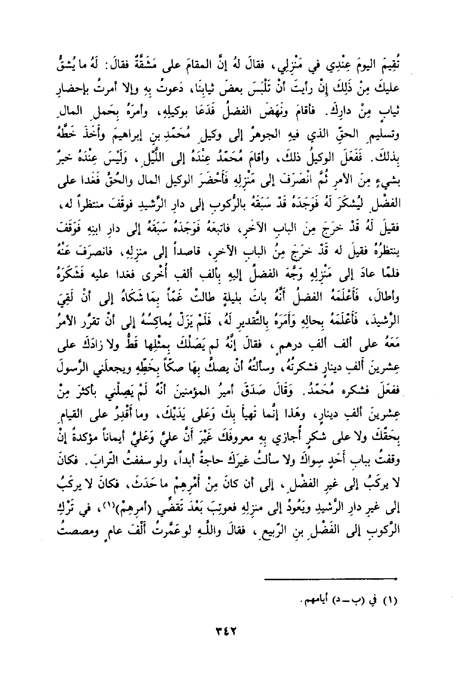 تقيم الْيَوْم عِنْدِي فِي منزلي فَقَالَ لَهُ إِن الْمقَام على مشقة فَقَالَ لَهُ مَا يشق عَلَيْك من ذَلِك إِن رَأَيْت أَن تلبس بعض ثيابًا دَعَوْت بِهِ وَإِلَّا أمرت بإحضار ثِيَاب من دَارك فَأَقَامَ ونهض الْفضل فَدَعَا بوكيله وَأمره بِحمْل المَال وَتَسْلِيم الْحق الَّذِي فِيهِ الْجَوْهَر إِلَى وَكيل مُحَمَّد بن إِبْرَاهِيم وَأخذ خطه بذلك فَفعل الْوَكِيل ذَلِك وَأقَام مُحَمَّد عِنْده إِلَى اللَّيْل وَلَيْسَ عِنْده خبر بِشَيْء من الْأَمر ثمَّ انْصَرف إِلَى منزله فأحضر الْوَكِيل المَال وَالْحق فغدا على الْفضل ليشكر لَهُ فَوَجَدَهُ قد سبقه بالركوب إِلَى دَار الرشيد فَوقف منْظرًا لَهُ فَقبل لَهُ قد خرج من الْبَاب الآخر فَأتبعهُ فَوَجَدَهُ سبقه إِلَى دَار ابْنه فَوقف ينتظره فَقيل لَهُ قد خرج من الْبَاب الآخر قَاصِدا إِلَى منزله فَانْصَرف عَنهُ فَلَمَّا عدا إِلَى منزله وَجه الْفضل إِلَيْهِ بِأَلف ألف أُخْرَى فغدا عَلَيْهِ فشكره وَأطَال فَأعلمهُ الْفضل أَنه بَات بليلة طَالَتْ غما بِمَا شكاه إِلَى أَن لَقِي الرشيد فَأعلمهُ بِحَالهِ وَأمره بالتقدير لَهُ فَلم يزل يماكسه إِلَى أَن تقرر الْأَمر مَعَه على ألف ألف دِرْهَم فَقَالَ إِنَّه لم يصلك بِمِثْلِهَا قطّ وَلَا زادك على عشْرين ألف دِينَار فشكرته وَسَأَلته أَن يصك بهَا صكا بخطة ويجعلني الرَّسُول فَفعل فشكره مُحَمَّد وَقَالَ صدق أَمِير الْمُؤمنِينَ أَنه لم يصلني بِأَكْثَرَ من عشْرين ألف دِينَار وَهَذَا إِنَّمَا تهَيَّأ بك وعَلى يَديك وَمَا أقدر على الْقيام بحقك وَلَا على شكر أجازي بِهِ مَعْرُوفك غير أَن عَليّ وَعلي أيمانا مُؤَكدَة إِن وقف بِبَاب أحد سواك وَلَا سَأَلت غَيْرك حَاجَة أَبَا وَلَو سففت التُّرَاب فَكَانَ لَا يركب إِلَى غير الْفضل إِلَى أَن كَانَ من أَمرهم مَا حدث فَكَانَ لَا يركب إِلَى غير دَار الرشيد وَيعود إِلَى منزله فعوتب بعد تقضي أَمرهم فِي ترك الرّكُوب إِلَى الْفضل بن الرّبيع فَقَالَ وَالله لَو عمرت ألف عَام ومصصت