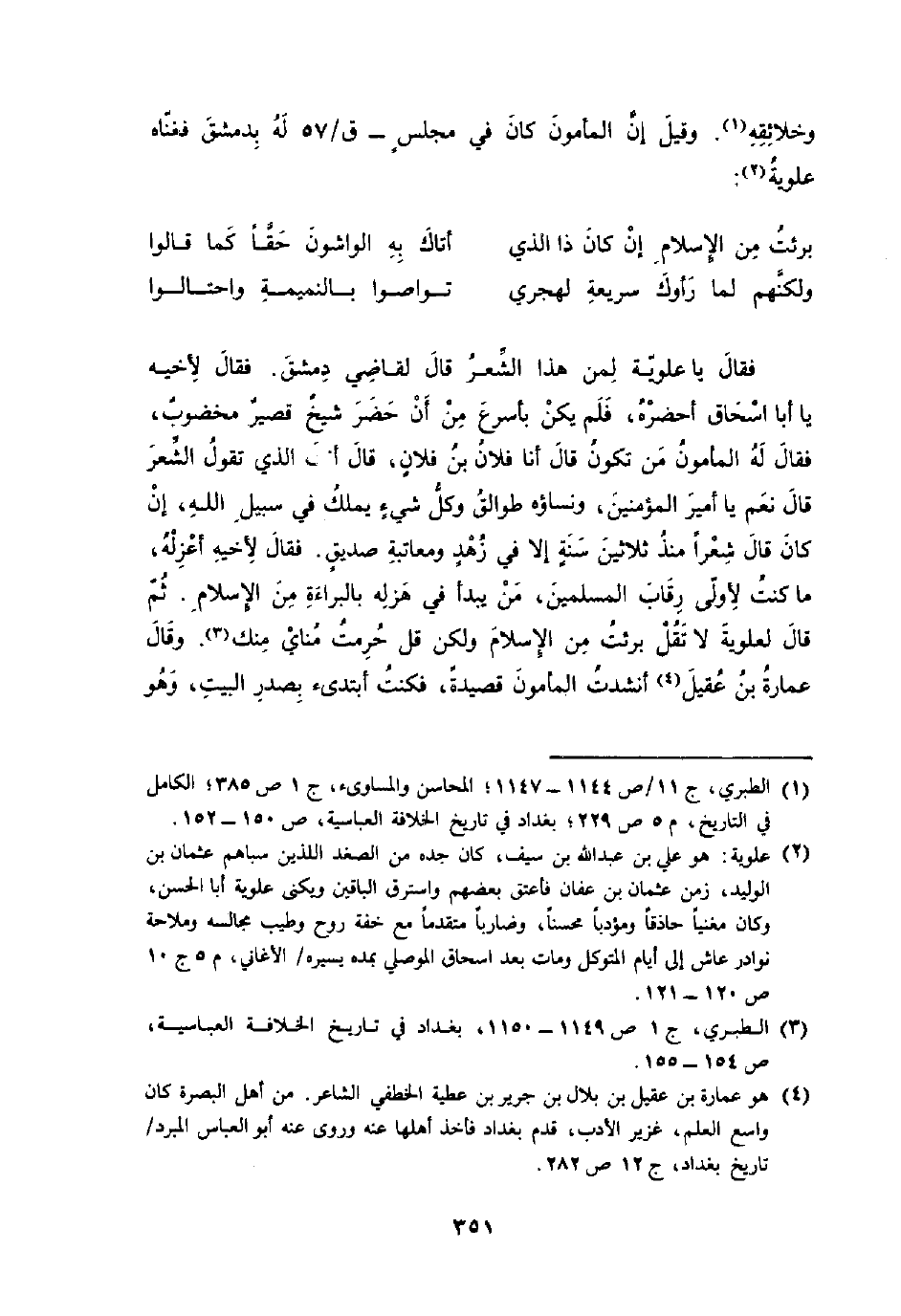 فَقَالَ يَا علوِيَّة لمن هَذَا الشّعْر قَالَ لقَاضِي دمشق فَقَالَ لِأَخِيهِ يَا أَبَا إِسْحَاق أحضرهُ فَلم يكن بأسرع من أَن حضر شيخ قصير مخضوب فَقَالَ لَهُ الْمَأْمُون من تكون قَالَ أَنا فلَان بن فلَان قَالَ أَنْت الَّذِي تَقول الشّعْر قَالَ نعم يَا أَمِير الْمُؤمنِينَ ونساؤه طَوَالِق وكل شَيْء يملك فِي سَبِيل الله إِن كَانَ قَالَ شعرًا مُنْذُ ثَلَاثِينَ سنة إِلَّا فِي زهد ومعاتبة صديق فَقَالَ لِأَخِيهِ أعزله مَا كنت لأولي رِقَاب الْمُسلمين من يبْدَأ فِي هزله من الْإِسْلَام ثمَّ قَالَ لعلوية لَا تقل بَرِئت من الْإِسْلَام وَلَكِن قل حرمت مناي مِنْك وَقَالَ عمَارَة بن عقيل أنشدت الْمَأْمُون قصيدة فَكنت أبتدئ بصدر الْبَيْت وَهُوَ