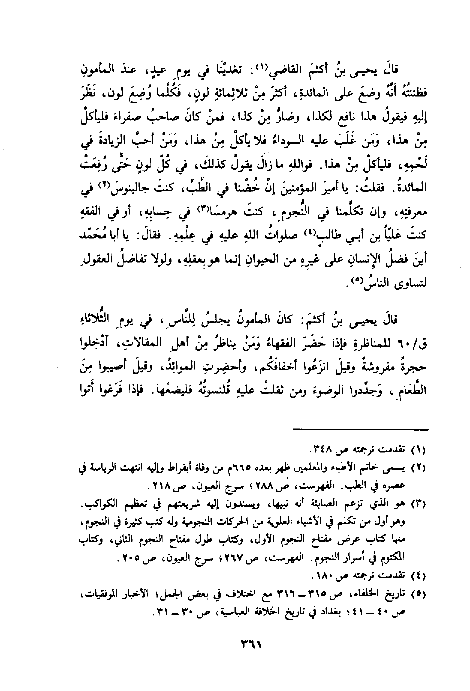 قَالَ يحي بن أَكْثَم القَاضِي تغدينا فِي يَوْم عيد عَن الْمَأْمُون فظننته أَنه وضع على الْمَائِدَة أَكثر من ثَلَاثمِائَة لون فَكلما وضع لون نظر إِلَيْهِ فَيَقُول هَذَا نَافِع لكذا وضار من كَذَا فَمن كَانَ صَاحب صفراء فَليَأْكُل من هَذَا وَمن غلب عَلَيْهِ السَّوْدَاء فَلَا يَأْكُل من هَذَا وَمن أحب الزِّيَادَة فِي لَحْمه فَليَأْكُل من هَذَا فوَاللَّه مازال يَقُول كَذَا فِي كل لون حَتَّى رفعت الْمَائِدَة فَقلت يَا أَمِير الْمُؤمنِينَ إِن خضنا فِي الطِّبّ كنت جالينوس فِي مَعْرفَته وَإِن تكلمنا فِي النُّجُوم كنت هرمسا فِي حسابه أَو فِي الْفِقْه كنت عليا بن أبي طَالب صلوَات الله عَلَيْهِ فِي علمه فَقَالَ يَا أَبَا مُحَمَّد أَيْن فضل الْإِنْسَان على غَيره من الْحَيَوَان إِنَّمَا هُوَ بعقله وَلَوْلَا تفاضل الْعُقُول لتساوى النَّاس