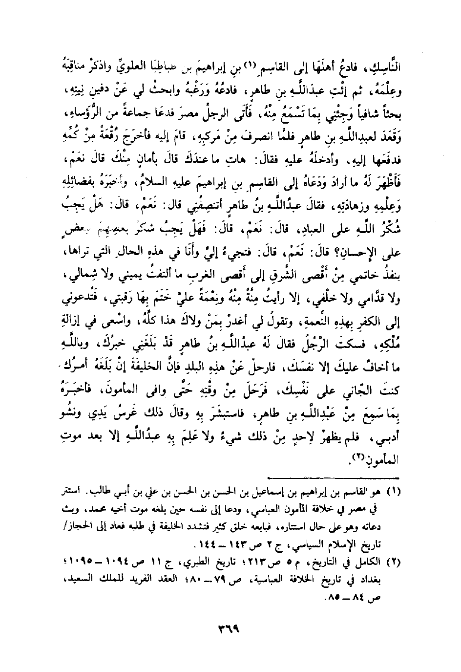 الناسك فَادع أَهلهَا إِلَى الْقَاسِم بن إِبْرَاهِيم بن طَبَاطَبَا الْعلوِي وَاذْكُر مناقبه وَعلمه ثمَّ إئت عبد الله بن طَاهِر فَادعه ورغبه وابحث لي عَن دَفِين نِيَّته بحثا شافيا وجئني بِمَا تسمع مِنْهُ فَأتى الرجل مصر فَدَعَا جمَاعَة من الرؤساء وَقعد لعبد الله بن طَاهِر فَلَمَّا انْصَرف من مركبه قَامَ إِلَيْهِ فَأخْرج رقْعَة من كمه فَدَفعهَا إِلَيْهِ وَأدْخلهُ عَلَيْهِ فَقَالَ هَات مَا عنْدك قَالَ بِأَمَان مِنْك قَالَ نعم فأظهر لَهُ مَا أَرَادَ وَدعَاهُ إِلَى الْقَاسِم بن إِبْرَاهِيم عَلَيْهِ السَّلَام واخبره بفضائله وَعلمه وزهادته فَقَالَ عبد اله بن طَاهِر أتنصفني قَالَ نعم قَالَ هَل يجب شكر الله على الْعباد قَالَ نعم قَالَ فَهَل يجب شكر بَعضهم لبَعض على الْإِحْسَان قَالَ نعم قَالَ فتجيء إِلَيّ وَأَنا فِي هَذِه الْحَال الَّتِي ترَاهَا ينفذ خَاتمِي من أقْصَى الشرق إِلَى أقْصَى الغرب مَا ألتفت يَمِيني وَلَا شمَالي وَلَا قدامي وَلَا خَلْفي إِلَّا رَأَيْت منَّة مِنْهُ ونعمة عَليّ ختم بهَا رقبتي فتدعوني إِلَى الْكفْر بِهَذِهِ النِّعْمَة وَتقول لي اغدر بِمن ولاك هَذَا كُله وأسعى فِي إِزَالَة ملكه فَسكت الرجل فَقَالَ لَهُ عبد الله بن طَاهِر قد بَلغنِي خبرك وَبِاللَّهِ مَا أَخَاف عَلَيْك إِلَّا نَفسك فارحل عَن هَذَا الْبَلَد فَإِن الْخَلِيفَة إِن بلغه أَمرك كنت الْجَانِي على نَفسك فَرَحل من وقته حَتَّى وافى الْمَأْمُون فَأخْبرهُ بِمَا سمع من عبد الله بن طَاهِر فَاسْتَبْشَرَ بِهِ وَقَالَ ذَلِك غرس يَدي ونشو أدبي فَلم يظْهر لأحد من ذَلِك شَيْء إِلَّا بعد موت الْمَأْمُون