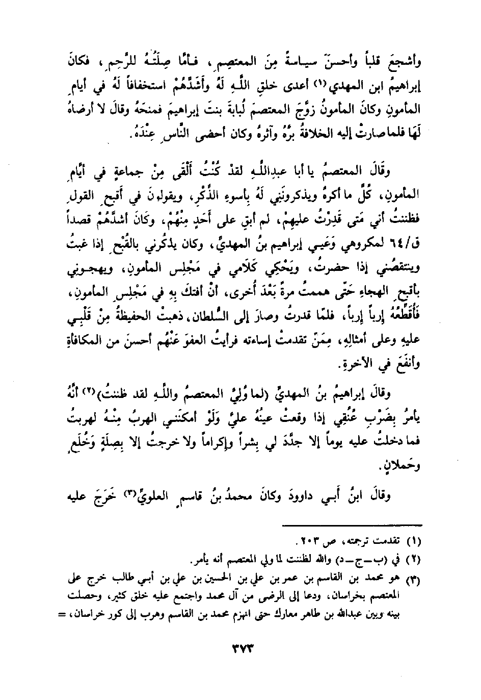 وَقَالَ المعتصم يَا أَبَا عبد الله لقد كنت ألْقى من جمَاعَة فِي أَيَّام الْمَأْمُون كل مَا أكره ويذكرونني لَهُ بِأَسْوَأ الذّكر وَيَقُولُونَ فِي أقبح القَوْل فَظَنَنْت أَنِّي مَتى قدرت عَلَيْهِم لم أبق على أحد مِنْهُم وَكَانَ أَشَّدهم قصدا ق 64 لمكروهي وعيي إِبْرَاهِيم بن الْمهْدي وَكَانَ يذكرنِي بالقبح إِذا غبت وينتقصني إِذا حضرت ويحكي كَلَامي فِي مجْلِس الْمَأْمُون ويهجوني بأقبح الهجاء حَتَّى هَمَمْت مرّة بعد أُخْرَى أَن أفتك بِهِ فِي مجْلِس الْمَأْمُون فأقطعه إربا إربا فَلَمَّا قدرت وَصَارَ إِلَى السُّلْطَان ذهبت الحفيظة من قلبِي عَلَيْهِ وعَلى أَمْثَاله مِمَّن تقدّمت إساءته فَرَأَيْت الْعَفو عَنْهُم أحسن من الْمُكَافَأَة وأنفع فِي الْآخِرَة
