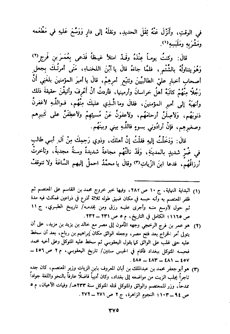 قَالَ وَدخلت إِلَيْهِ فَقلت إِن أهلك وَذَوي رَحِمك من آل أبي طَالب فِي ضرّ شَدِيد بِالْمَدِينَةِ وَقد نالتهم مجاعَة شَدِيدَة وَسنة مُجْدِبَة وتأخرت أَرْزَاقهم فَدَعَا ابْن الزيات وَقَالَ يَا مُحَمَّد احْمِلْ إِلَيْهِم السَّاعَة وَلَا تتَوَقَّف