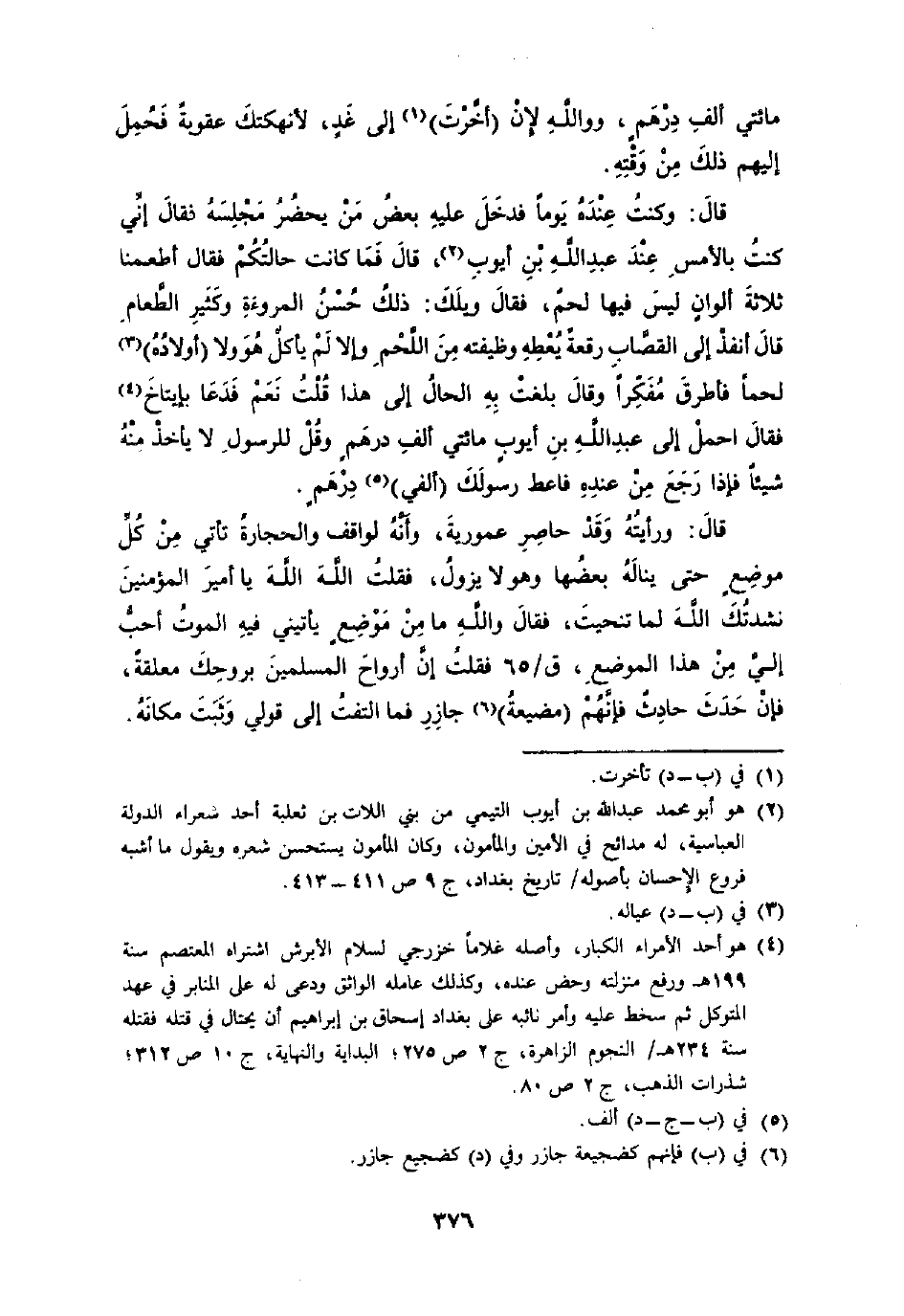 قَالَ وَكنت عِنْده يَوْمًا فَدخل عَلَيْهِ بعض من يحضر مَجْلِسه فَقَالَ إِنِّي كنت بالْأَمْس عِنْد عبد الله بن أَيُّوب قَالَ فَمَا كَانَت حالتكم فَقَالَ أطعمنَا ثَلَاثَة ألوان لَيْسَ فِيهَا لحم فَقَالَ وَيلك ذَلِك حسن الْمُرُوءَة وَكثير الطَّعَام قَالَ أنفذ إِلَى القصاب رقْعَة يُعْطه وظيفته من اللَّحْم والألم يَأْكُل هُوَ وَلَا أَوْلَاده لَحْمًا فَأَطْرَقَ مفكرا وَقَالَ بلغت بِهِ الْحَال إِلَى هَذَا قلت نعم فَدَعَا بإيتاخ فَقَالَ احْمِلْ إِلَى عبد الله بن أَيُّوب مِائَتي ألف دِرْهَم وَقل للرسول لَا يَأْخُذ مِنْهُ شَيْئا فَإِذا رَجَعَ من عِنْده فأعط رَسُولك ألفي دِرْهَم