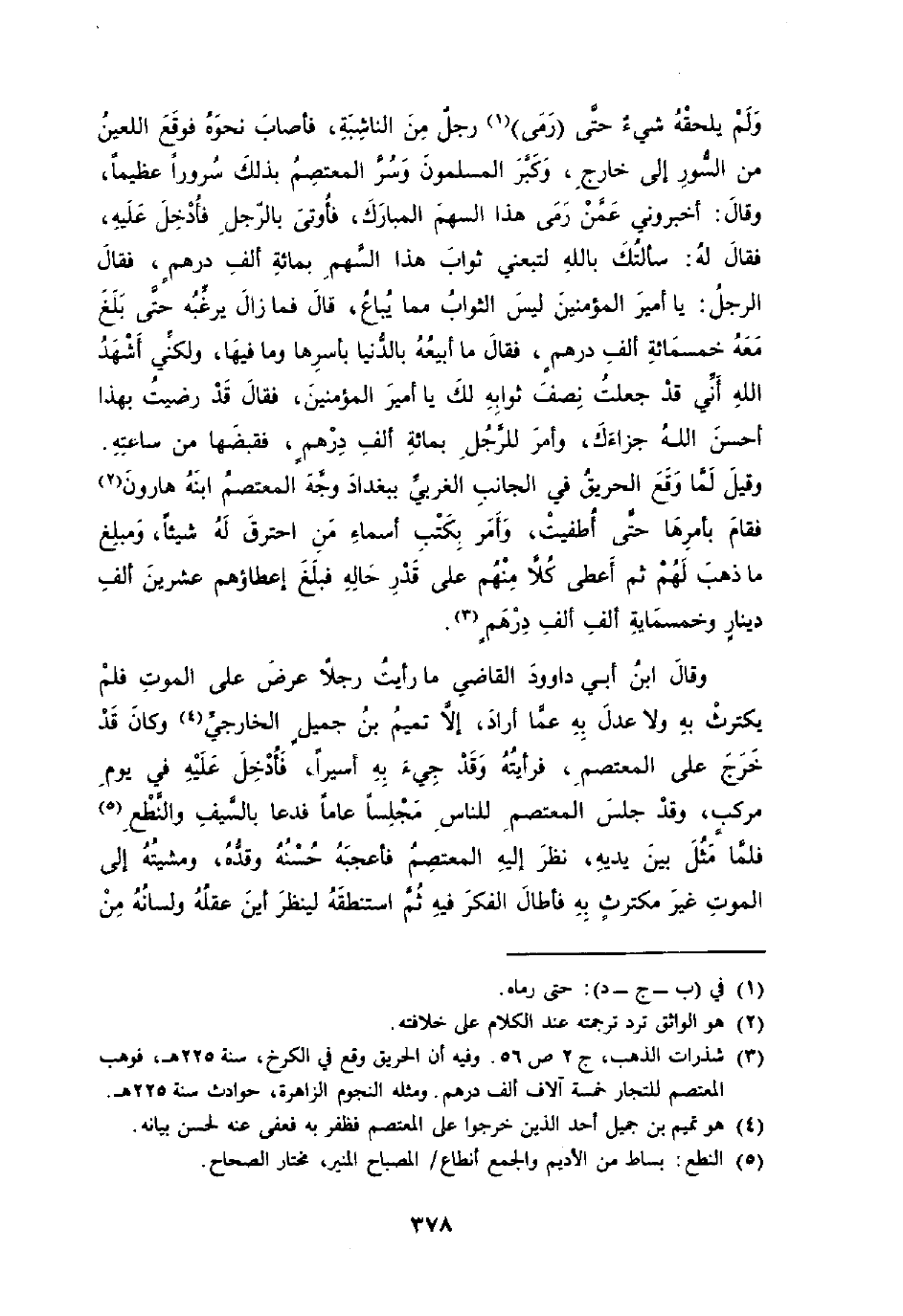 وَلم يلْحقهُ شَيْء حَتَّى رمى رجل من الناشبة فَأصَاب نَحوه فَوَقع اللعين من السُّور إِلَى خَارج وَكبر الْمُسلمُونَ وسر المعتصم بذلك سُرُورًا عَظِيما وَقَالَ اخبروني عَمَّن رمى هَذَا السهْم الْمُبَارك فأوتى بِالرجلِ فَأدْخل عَلَيْهِ فَقَالَ لَهُ سَأَلتك بِاللَّه لتبعني ثَوَاب هَذَا السهْم بِمِائَة ألف دِرْهَم فَقَالَ الرجل يَا أَمِير الْمُؤمنِينَ لَيْسَ الثَّوَاب مِمَّا يُبَاع قَالَ فَمَا زَالَ يرغبه حَتَّى بلغ مَعَه خَمْسمِائَة ألف دِرْهَم فَقَالَ مَا أبيعه بالدنيا بأسرها وَمَا فِيهَا وَلَكِنِّي أشهد الله أَنِّي قد جعلت نصف ثَوَابه لَك يَا أَمِير الْمُؤمنِينَ فَقَالَ قد رضيت بِهَذَا أحسن الله جزائك وَأمر للرجل بِمِائَة ألف دِرْهَم فقبضها من سَاعَته وَقيل لما وَقع الْحَرِيق فِي الْجَانِب الغربي بِبَغْدَاد وَجه المعتصم ابْنه هَارُون فَقَامَ بأمرها حَتَّى أطفيت وَأمر بكتب أَسمَاء من احْتَرَقَ لَهُ شَيْئا ومبلغ مَا ذهب لَهُم ثمَّ أعْطى كلا مِنْهُم على قدر حَالَة فَبلغ إعطاؤهم عشْرين ألف دِينَار وَخَمْسمِائة ألف ألف دِرْهَم