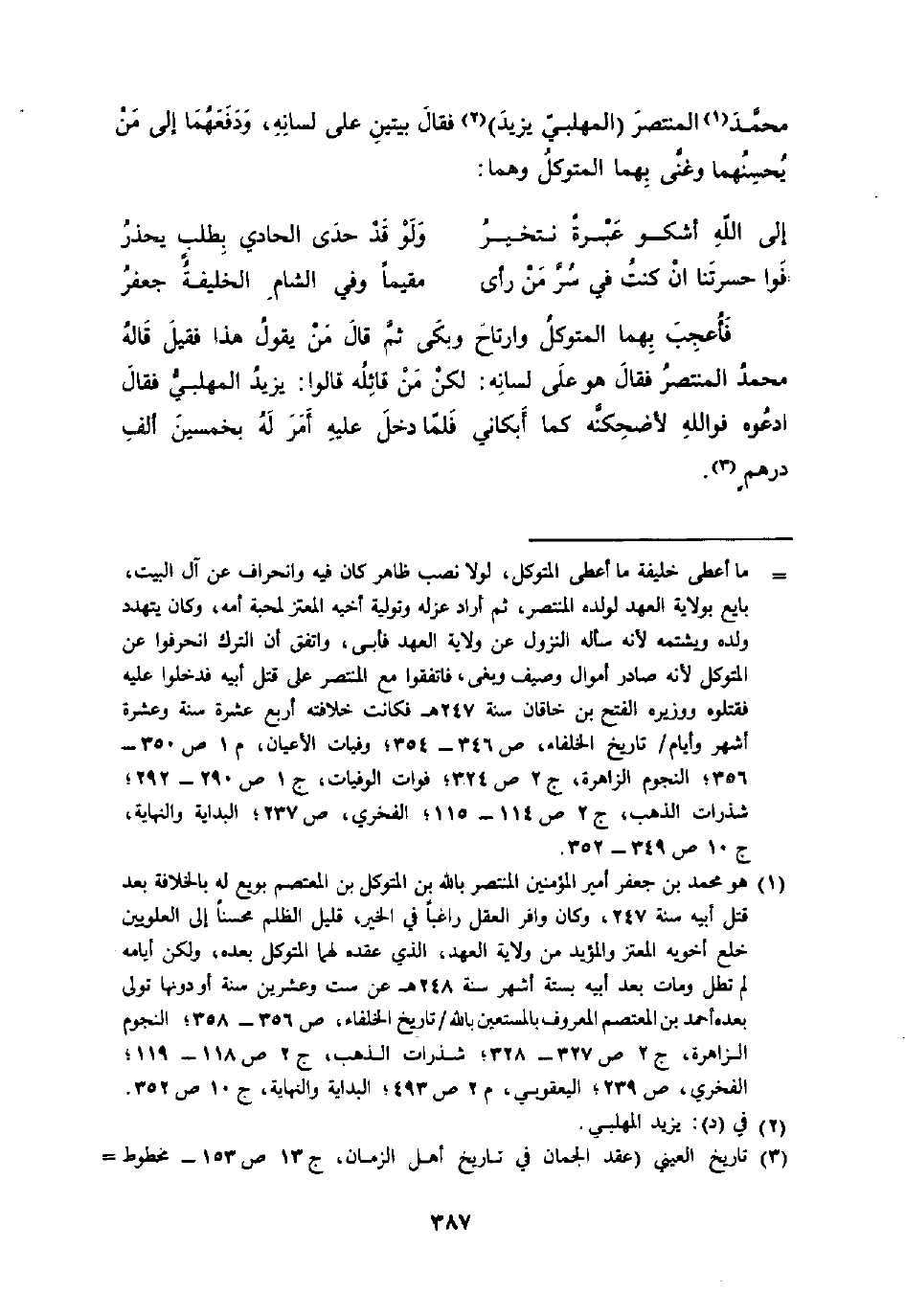 مُحَمَّد الْمُنْتَصر المهلبي يزِيد فَقَالَ بَيْتَيْنِ على لِسَانه ودفعهما إِلَى من يحسنهما وغنى بهما المتَوَكل وهما