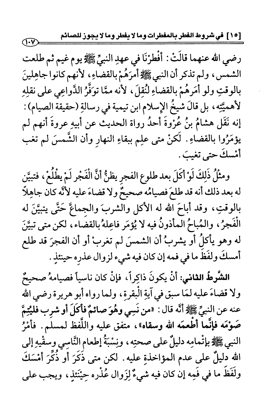 الشَّرطُ الثاني: أنْ يكونَ ذاكِراً، فإنْ كان ناسياً فصيامهُ صحيحٌ ولا قضاءَ عليه لمَا سبق في آيةِ الْبقرةِ، ولما رواه أبو هريرة رضي الله عنه عن النبيِّ صلى الله عليه وسلّم أنَّه قال: «من نَسِي وهُوَ صائمٌ فأكَلَ أو شرِب فليُتِمَّ صَوْمَه فإنَّما أطْعمَه الله وسقاه»، متفق عليه واللَّفظ لمسلم. فأمْرُ النبي صلى الله عليه وسلّم بإتْمامِه دليلٌ على صحتِه، ونِسْبَةُ إطعام النَّاسِي وسقْيهِ إلى الله دليلٌ على عدم المؤاخذةِ عليه. لكن متى ذَكَرَ أو ذُكِّرَ أمْسَكَ ولَفَظَ ما في فَمِه إن كان فيه شيءٌ لِزَوال عُذْره حِيْنَئذٍ، ويجب على