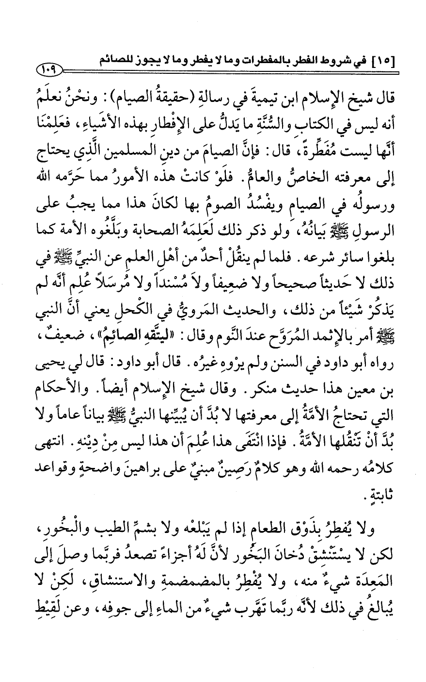 قال شيخ الإِسلام ابن تيميةَ في رسالةِ (حقيقةُ الصيام): ونحْنُ نعلَمُ أنه ليس في الكتابِ والسُّنَّةِ ما يَدلُّ على الإِفْطارِ بهذه الأشَياءِ، فعَلِمْنَا أنَّها ليست مُفَطِّرةً، قال: فإنَّ الصيامَ من دينِ المسلمين الَّذِي يحتاج إلى معرفته الخاصُّ والعامُّ. فلَوْ كانتْ هذه الأمورُ مما حَرَّمه الله ورسولُه في الصيامِ ويفْسُدُ الصومُ بها لكانَ هذا مما يجبُ على الرسولِ صلى الله عليه وسلّم بَيانُهُ، ولو ذكر ذلك لَعَلِمَهُ الصحابة وبَلَّغُوه الأمة كما بلغوا سائر شرعه. فلما لم ينقُلْ أحدٌ من أهْلِ العلمِ عن النبيِّ صلى الله عليه وسلّم في ذلك لا حَديثاً صحيحاً ولا ضعِيفاً ولاَ مُسْنداً ولا مُرسَلاً عُلِم أنَّه لم يَذكُرْ شَيْئاً من ذلك، والحديث المَرويُّ في الكْحلِ يعني أنَّ النبي صلى الله عليه وسلّم أمر بالإِثمد المُرَوَّح عندَ النَّوم وقال: «ليتَّقهِ الصائِمُ»، ضعيفٌ، رواه أبو داود في السنن ولم يرْوهِ غيرُه. قال أبو داود: قال لي يحيى بن معين هذا حديث منكر. وقال شيخ الإِسلام أيضاً. والأحكام التي تحتاجُ الأمَّةُ إلى معرفتها لا بُدَّ أن يُبيِّنها النبيُّ صلى الله عليه وسلّم بياناً عاماً ولا بُدَّ أنْ تَنْقُلها الأمَّةُ. فإذا انْتَفَى هذا عُلِمَ أن هذا ليس مِنْ دِيْنهِ. انتهى كلامُه رحمه الله وهو كلامٌ رَصِينٌ مبنيٌ على براهينَ واضحةٍ وقواعد ثابتةٍ.