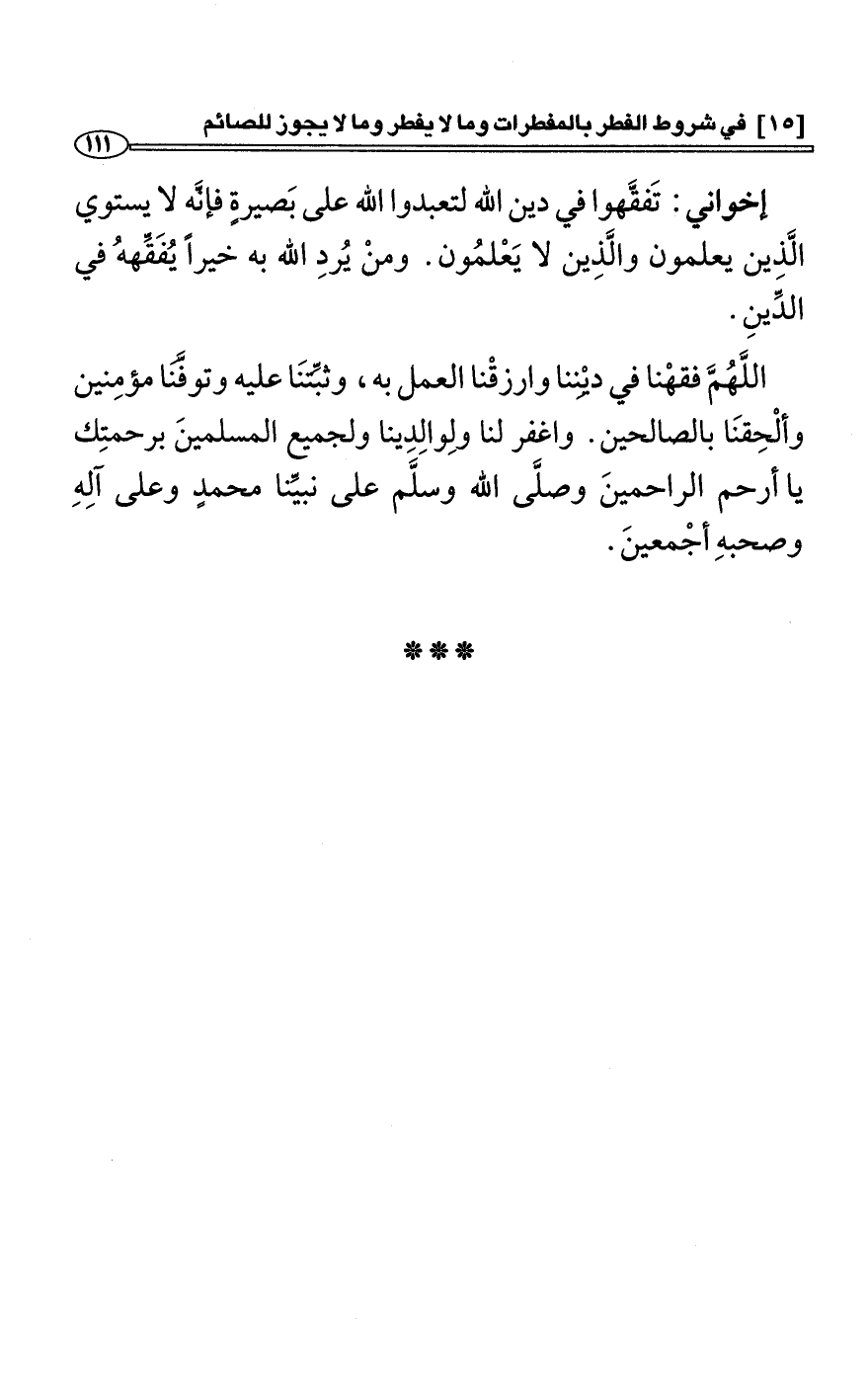اللَّهُمَّ فقهْنا في ديْنِنا وارزقْنا العمل به، وثبِّتنَا عليه وتوفَّنَا مؤمِنين وألْحِقنَا بالصالحين. واغفر لنا ولِوالِدِينا ولجميع المسلمينَ برحمتِك يا أرحم الراحمينَ وصلَّى الله وسلَّم على نبيِّنا محمدٍ وعلى آلِهِ وصحبهِ أجْمعينَ.