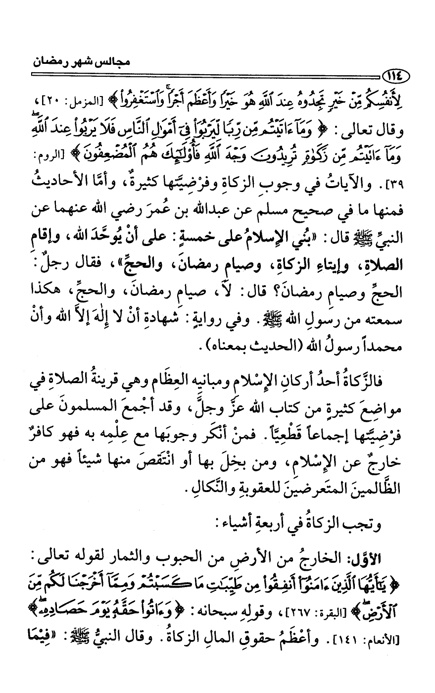 لأنفُسِكُمْ مِّنْ خَيْرٍ تَجِدُوهُ عِندَ اللَّهِ هُوَ خَيْراً وَأَعْظَمَ أَجْراً وَاسْتَغْفِرُواْ اللَّهَ إِنَّ اللَّهَ غَفُورٌ رَّحِيمٌ} [المزمل: 20]، وقال تعالى: {وَمَآءَاتَيْتُمْ مِّن رِّباً لِّيَرْبُوَاْ فِى أَمْوَالِ النَّاسِ فَلاَ يَرْبُواْ عِندَ اللَّهِ وَمَآ ءاتَيْتُمْ مِّن زَكَوةٍ تُرِيدُونَ وَجْهَ اللَّهِ فَأُولَئِكَ هُمُ الْمُضْعِفُونَ} [الروم: 39]. والآياتُ في وجوبِ الزكاةِ وفرْضِيَّتها كثيرةٌ، وأمَّا الأحاديثُ فمنها ما في صحيح مسلم عن عبدالله بن عُمرَ رضي الله عنهما عن النبيِّ صلى الله عليه وسلّم قال: «بُني الإِسلامُ على خمسةٍ: على أنْ يُوحَّدَ الله، وإقامِ الصلاةِ، وإيتاءِ الزكاةِ، وصيامِ رمضانَ، والحجِّ»، فقال رجلٌ: الحجِّ وصيامِ رمضانَ؟ قال: لاَ، صيامِ رمضانَ، والحجِّ، هكذا سمعته من رسولِ الله صلى الله عليه وسلّم. وفي روايةٍ: شهادةِ أنْ لا إِلهَ إلاَّ الله وأنْ محمداً رسولُ الله (الحديث بمعناه).