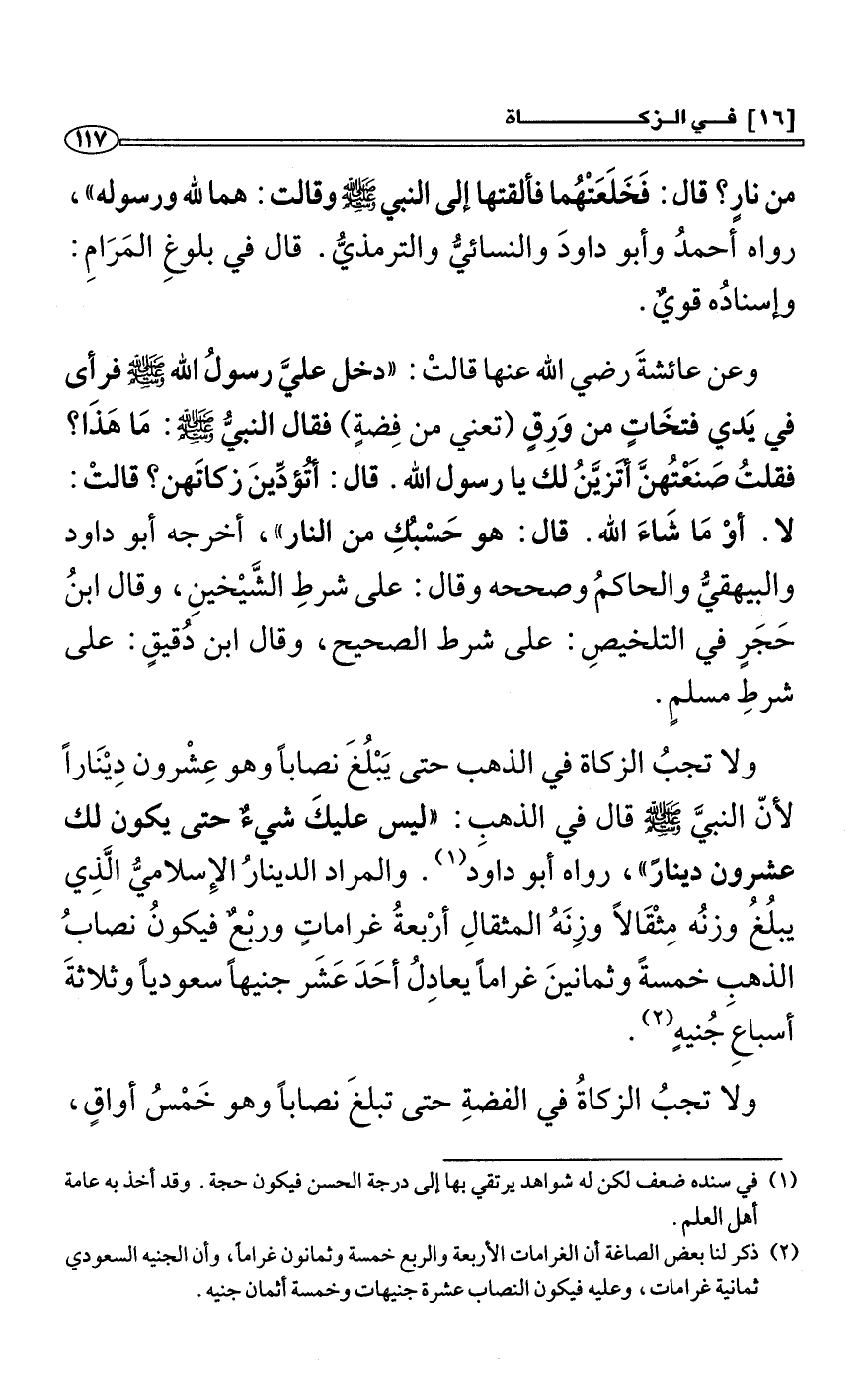 وعن عائشةَ رضي الله عنها قالتْ: «دخل عليَّ رسولُ الله صلى الله عليه وسلّم فرأى في يَدي فتخَاتٍ من وَرِقٍ (تعني من فِضةٍ) فقال النبيُّ صلى الله عليه وسلّم: مَا هَذَا؟ فقلتُ صَنَعْتُهنَّ أتَزيَّنُ لك يا رسول الله. قال: أتُؤدِّينَ زكاتَهن؟ قالتْ: لا. أوْ مَا شَاءَ الله. قال: هو حَسْبُكِ من النار»، أخرجه أبو داود والبيهقيُّ والحاكمُ وصححه وقال: على شرطِ الشَّيْخينِ، وقال ابنُ حَجَرٍ في التلخيصِ: على شرط الصحيح، وقال ابن دُقيقٍ: على شرطِ مسلمٍ.