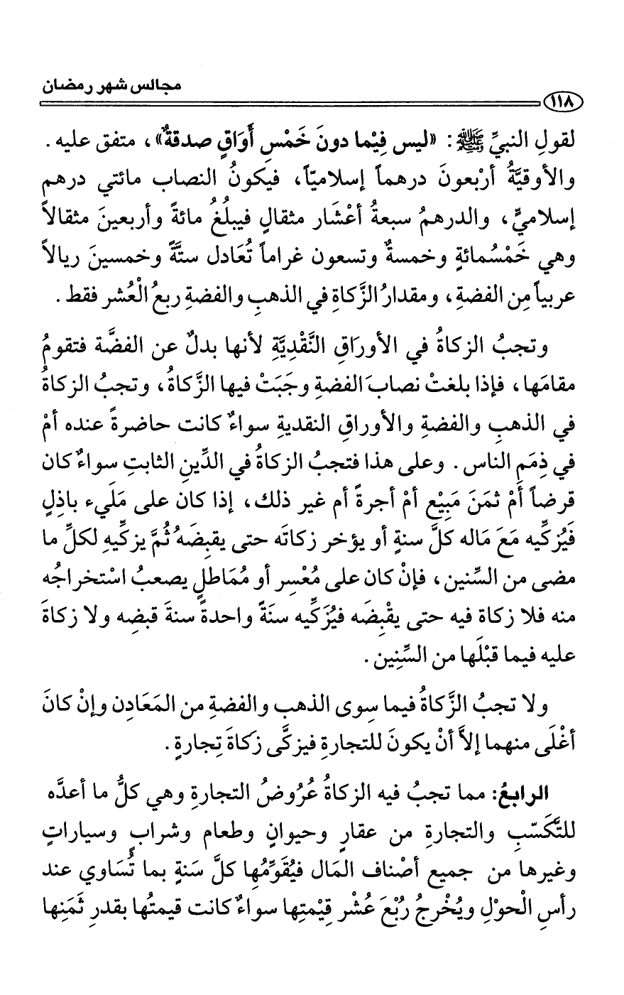الرابعُ: مما تجبُ فيه الزكاةُ عُرُوضُ التجارةِ وهي كلُّ ما أعدَّه للتَّكَسّبِ والتجارةِ من عقارٍ وحيوانٍ وطعام وشرابٍ وسياراتٍ وغيرها من جميع أصْناف المَال فيُقَوِّمُهِا كلَّ سَنةٍ بما تُسَاوي عند رأسِ الْحوْلِ ويُخْرجُ رُبْعَ عُشْر قِيْمتِها سواءٌ كانت قيمتُها بقدرِ ثَمَنِها