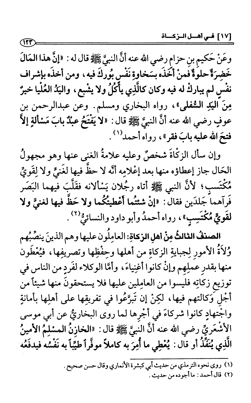 وعَنْ حَكيمِ بنِ حزامٍ رضي الله عنه أنَّ النبيَّ صلى الله عليه وسلّم قال له: «إنَّ هذا المَالَ خَضِرَةٌ حلوةٌ فمنْ أخَذَه بسَخاوةِ نَفْسٍ بُوركَ فيه، ومن أخذَه بإشراف نفْسٍ لم يباركْ له فيه وكان كالَّذِي يأكُلُ ولا يشْبع، واليَدُ العُلْيا خيرٌ مِنَ اليَدِ السُّفلى»، رواه البخاري ومسلم. وعن عبدالرحمن بن عوفٍ رضي الله عنه أنَّ النبيَّ صلى الله عليه وسلّم قال: «لا يَفْتَحُ عبْدٌ بابَ مَسْألةٍ إلاَّ فتحَ الله عليه بابَ فقر»، رواه أحمد (¬1).
