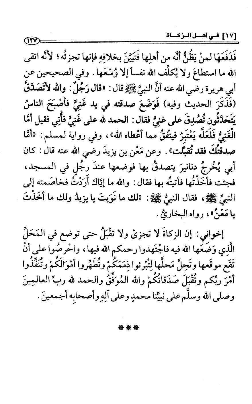 إخواني: إن الزكاةَ لا تجزأ ولا تقْبَلُ حتى توضع في المَحَلِّ الَّذِي وَضَعَها الله فيه فاجْتَهدوا رحمكم الله فيها، واحْرصُوا على أنْ تَقَع موقَعها وتَحِلَّ مَحلَّها لِتُبْرئوا ذِمَمَكُمْ وتُطَهِّروا أمْوَالَكُمْ وتُنَفِّذُوا أمْرَ ربِّكم وتُقْبَلَ صَدَقاتُكُمْ والله المُوَفِّقُ والحمد لله ربِّ العالمِينَ وصلى الله وسلَّم على نبيِّنا محمدٍ وعلى آلِهِ وأصحابِه أجمعينَ.