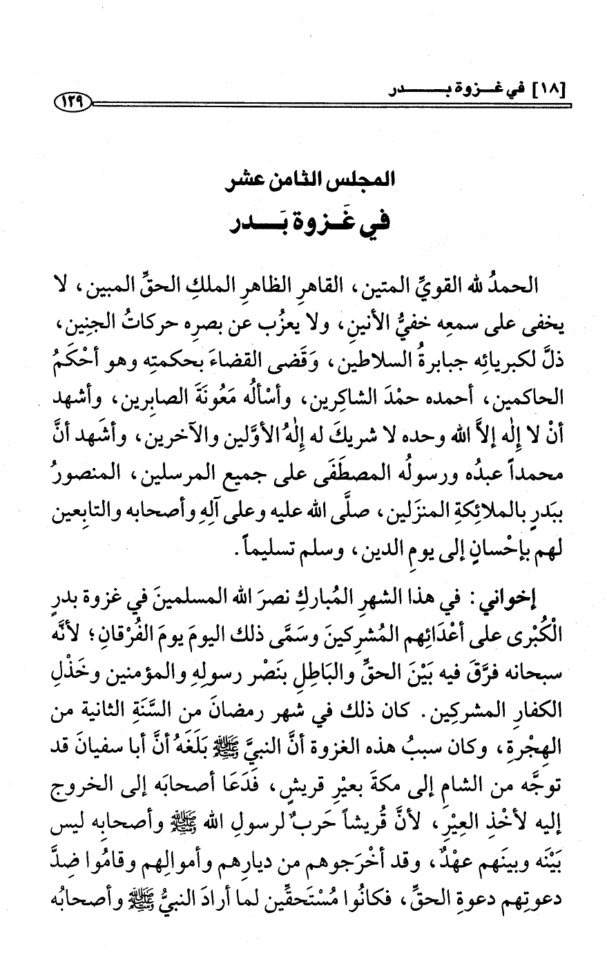 الحمدُ لله القويِّ المتين، القاهرِ الظاهرِ الملكِ الحقِّ المبين، لا يخفى على سمعِه خفيُّ الأنينِ، ولا يعزُب عن بصرِه حركاتُ الجنِين، ذلَّ لكبريائِه جبابرةُ السلاطين، وَقَضى القضاءَ بحكمتِه وهو أحْكَمُ الحاكمين، أحمده حمْدَ الشاكِرين، وأسْألُه مَعُونَةَ الصابِرين، وأشهد أنْ لا إِله إلاَّ الله وحده لا شريكَ له إِلهُ الأوَّلين والآخرين، وأشَهد أنَّ محمداً عبدُه ورسولُه المصطَفَى على جميع المرسلين، المنصورُ ببَدرٍ بالملائِكةِ المنزَلين، صلَّى الله عليه وعلى آلِهِ وأصحابه والتابِعين لهم بإحْسانٍ إلى يومِ الدين، وسلم تسليماً.