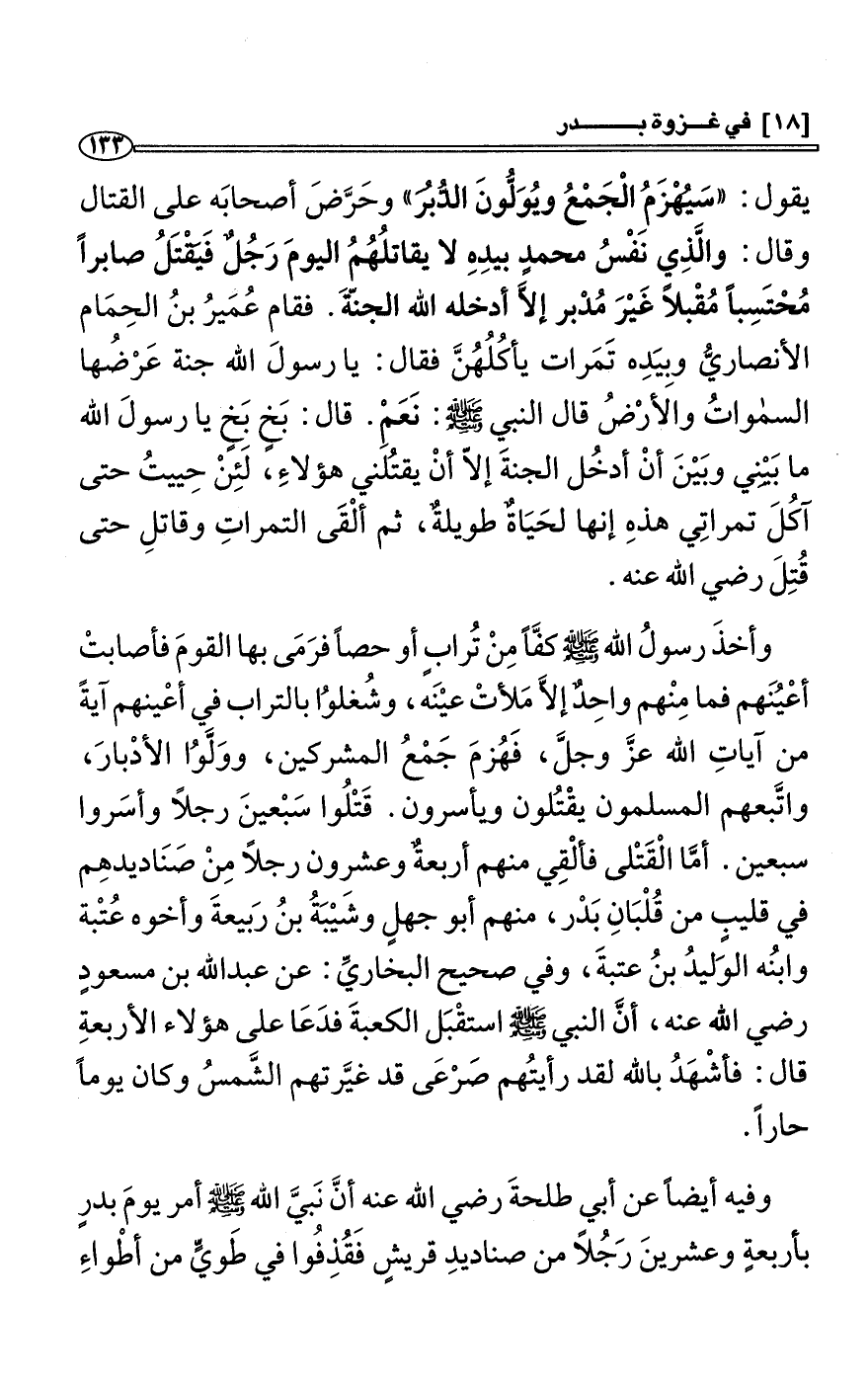 يقول: «سَيُهْزَمُ الْجَمْعُ ويُوَلُّونَ الدُّبُرَ» وحَرَّضَ أصحابَه على القتال وقال: والَّذِي نَفْسُ محمدٍ بيدِهِ لا يقاتلُهُمُ اليومَ رَجُلٌ فَيَقْتَلُ صابراً مُحْتَسِباً مُقْبلاً غَيْرَ مُدْبر إلاَّ أدخله الله الجنّةَ. فقام عُمَيرُ بنُ الحِمَام الأنصاريُّ وبِيَدِه تَمَرات يأكُلُهُنَّ فقال: يا رسولَ الله جنة عَرْضُها السمواتُ والأرْضُ قال النبي صلى الله عليه وسلّم: نَعَمْ. قال: بَخٍ بَخٍ يا رسولَ الله ما بَيْنِي وبَيْنَ أنْ أدخُل الجنةَ إلاّ أنْ يقتُلَني هؤلاءِ، لَئِنْ حِييتُ حتى آكُلَ تمراتِي هذهِ إنها لحَيَاةٌ طويلةٌ، ثم ألْقَى التمراتِ وقاتلِ حتى قُتِلَ رضي الله عنه.