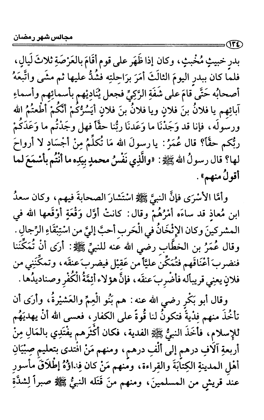 بدرٍ خبيثٍ مُخْبثٍ، وكان إذا ظَهَر على قوم أقَامَ بالعَرْصَةِ ثلاثَ لَيالٍ، فلما كان ببدرٍ اليومَ الثالَثَ أمَرَ برَاحِلتِه فشُدُّ عليها ثم مشَى واتَّبعَهُ أصحابُه حَتَّى قامَ على شَفَةِ الرَّكِيِّ فجعل يُنَادِيْهم بأسمائِهِم وأسماءِ آبائِهِم يا فلانُ بنَ فلانٍ ويا فلانُ بنَ فلانٍ أيَسُرُّكُمْ أنَّكُمْ أطْعتُمُ الله ورسولَه، فإنا قد وَجَدْنَا ما وَعَدنَا ربُّنا حقَّاً فهل وجَدْتُم ما وَعَدَكُمْ ربُّكم حقَّاً؟ قال عُمَرُ: يا رسولَ الله مَا تُكلِّمُ مِنْ أجْسَادٍ لا أرواحَ لها؟ قال رسولُ الله صلى الله عليه وسلّم: «والَّذِي نَفْسُ محمدٍ بِيَدِه ما أنْتُم بأسْمَعَ لما أقولُ منهم».