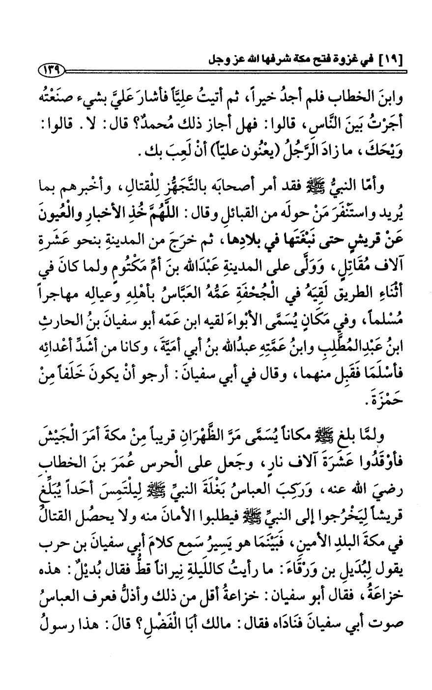 ولمَّا بلغ صلى الله عليه وسلّم مكاناً يُسَمَّى مَرَّ الظَّهْرَانِ قريباً مِنْ مكةَ أمَرَ الْجَيْشَ فأوْقَدُوا عَشَرَةَ آلاف نارٍ، وجَعل على الْحرس عُمَرَ بنَ الخطابِ رضيَ الله عنه، وَرَكِبَ العباسُ بَغْلَةَ النبيِّ صلى الله عليه وسلّم لِيلْتَمِسَ أحَداً يُبَلِّغِ قريشاً لِيَخْرُجوا إلى النبيِّ صلى الله عليه وسلّم فيطلبوا الأمانَ منه ولا يحصُل القتالُ في مكةَ البلدِ الأمينِ، فَبَيْنَمَا هو يَسِيرُ سَمِع كلامَ أبي سفيانَ بن حرب يقول لِبُدَيلِ بن وَرْقَاءَ: ما رأيتُ كاللَيلةِ نِيراناً قطُّ فقال بُديْلٌ: هذه خزاعَةُ، فقال أبو سفيان: خزاعةُ أقل من ذلك وأذلُّ فعرف العباسُ صوت أبي سفيانَ فنَادَاه فقال: مالك أبَا الْفَضْلِ؟ قالَ: هذا رسولُ