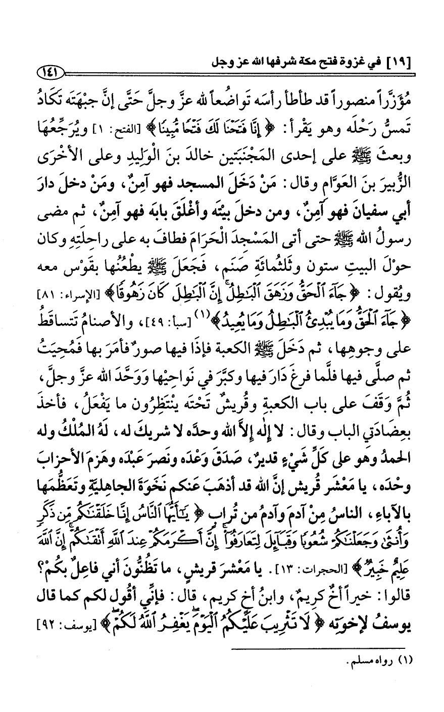 مُؤَزَّراً منصوراً قد طأطأ رأسَه تَواضُعاً لله عزَّ وجلَّ حَتَّى إنَّ جبْهَتَه تَكَادُ تَمسُّ رَحْلَه وهو يَقْرأ: {إِنَّا فَتَحْنَا لَكَ فَتْحاً مُّبِيناً} [الفتح: 1] ويُرَجِّعُهَا وبعثَ صلى الله عليه وسلّم على إحدى المَجْنَبَتين خالدَ بنَ الْوَلِيدِ وعلى الأخْرَى الزُّبيرَ بنَ العَوَّامِ وقال: مَنْ دَخَلَ المسجد فهو آمِنٌ، ومَنْ دخلَ دارَ أبي سفيانَ فهو آمِنٌ، ومن دخلَ بيْتَه وأغْلَقَ بابَه فهو آمِنٌ، ثم مضى رسولُ الله صلى الله عليه وسلّم حتى أتى المَسْجِدَ الْحَرَامَ فطافَ به على راحِلَتِهِ وكان حوْلَ البيتِ ستون وثَلاثُمائَةِ صَنَم، فَجَعَلَ صلى الله عليه وسلّم يطْعُنُها بقَوْس معه ويُقول: {جَآءَ الْحَقُّ وَزَهَقَ الْبَاطِلُ إِنَّ الْبَاطِلَ كَانَ زَهُوقًا} [الإِسراء: 81] {جَآءَ الْحَقُّ وَمَا يُبْدِىءُ الْبَاطِلُ وَمَا يُعِيدُ} (¬1) [سبأ: 49]، والأصنامُ تَتساقَطُ على وجوهِها، ثم دَخَلَ صلى الله عليه وسلّم الكعبة فإذَا فيها صورٌ فأمَرَ بها فَمُحِيَتُ ثم صلَّى فيها فلَّما فرغَ دَارَ فيها وكبَّرَ في نَواحِيْها وَوَحَّدَ الله عزَّ وجلَّ، ثُمَّ وَقَفَ على باب الكعبةِ وقُريشٌ تَحْتَه ينْتَظِرُون ما يَفْعَلُ، فأخذَ بعِضَادَتِي الباب وقال: لا إِله إِلاَّ الله وحدَّه لا شريكَ له، لَهُ المُلْكُ وله الحمدُ وهو على كَلِّ شَيْءٍ قديرٌ، صَدَقَ وَعْدَه ونَصرَ عَبْدَه وهَزمَ الأحزابَ وحْدَه، يا مَعْشَر قُريش إنَّ الله قد أذهَبَ عَنكم نَخَوَةَ الجاهِليَّةِ وتَعَظُّمَها بالآباءِ، الناسُ مِنْ آدمَ وآدمُ من تُرابٍ {يأَيُّهَا النَّاسُ إِنَّا خَلَقْنَاكُم مِّن ذَكَرٍ وَأُنْثَى وَجَعَلْنَاكُمْ شُعُوباً وَقَبَآئِلَ لِتَعَارَفُواْ إِنَّ أَكْرَمَكُمْ عَندَ اللَّهِ أَتْقَكُمْ إِنَّ اللَّهَ عَلِيمٌ خَبِيرٌ} [الحجرات: 13]. يا مَعْشرَ قريشٍ، ما تَظُنُّونَ أني فاعِلٌ بكُمْ؟ قالوا: خيراً أخٌ كرِيمٌ، وابنُ أخٍ كريم، قال: فإنِّي أقُول لكم كما قال يوسفُ لإخوَتِه {لاَ تَثْرَيبَ عَلَيْكُمُ الْيَوْمَ يَغْفِرُ اللَّهُ لَكُمْ وَهُوَ أَرْحَمُ الرَحِمِينَ} [يوسف: 92]