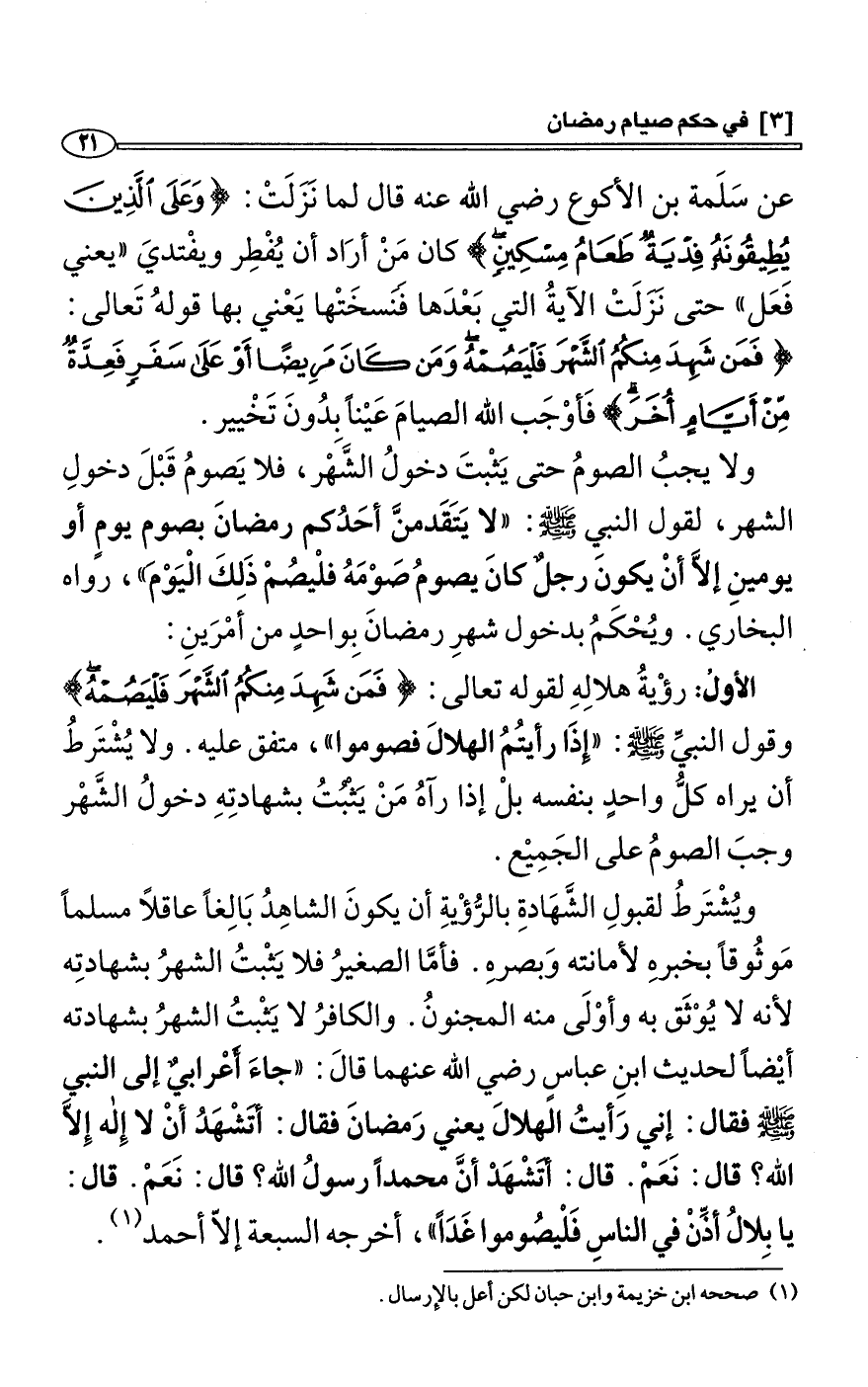 ويُشْتَرطُ لقبولِ الشَّهَادةِ بالرُّؤْيةِ أن يكونَ الشاهِدُ بَالِغاً عاقلاً مسلماً مَوثُوقاً بخبرهِ لأمانته وَبصرهِ. فأمَّا الصغيرُ فلا يَثْبتُ الشهرُ بشهادتِه لأنه لا يُوْثَق به وأوْلَى منه المجنونُ. والكافرُ لا يَثْبتُ الشهرُ بشهادته أيْضاً لحديث ابنِ عباسٍ رضي الله عنهما قالَ: «جاءَ أَعْرابيٌ إلى النبي صلى الله عليه وسلّم فقال: إني رَأيتُ الهلالَ يعني رَمضانَ فقال: أتَشْهَدُ أنْ لا إِله إِلاَّ الله؟ قال: نَعَمْ. قال: أتَشْهَدْ أنَّ محمداً رسولُ الله؟ قال: نَعَمْ. قال: يا بِلالُ أذِّنْ في الناسِ فَلْيصُوموا غَدَاً»، أخرجه السبعة إلاّ أحمد (¬1).