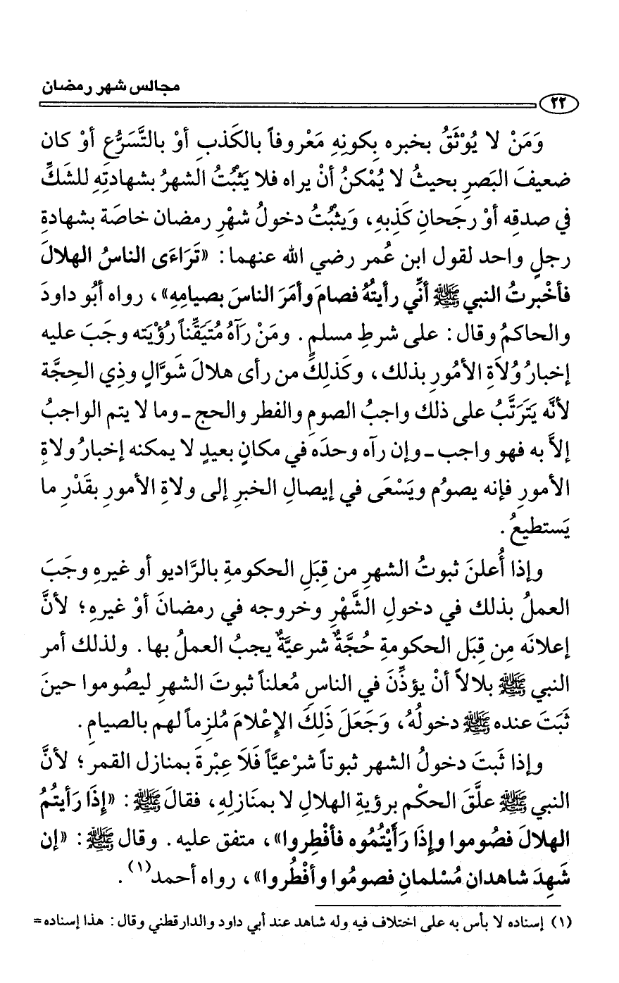 وَمَنْ لا يُوْثَقُ بخبره بِكونِهِ مَعْروفاً بالكَذبِ أوْ بالتَّسَرُّعِ أوْ كان ضعيفَ البَصرِ بحيثُ لا يُمْكنُ أنْ يراه فلا يَثْبُتُ الشهرُ بشهادتِهِ للشَكِّ في صدقِه أوْ رجَحانِ كَذِبهِ، وَيثْبُتُ دخولُ شهْرِ رمضان خاصَة بشهادةِ رجلٍ واحد لقول ابن عُمر رضي الله عنهما: «تَرَاءَى الناسُ الهلالَ فأخْبرتُ النبي صلى الله عليه وسلّم أنِّي رأيتُهُ فصامَ وأمَرَ الناسَ بصيامِهِ»، رواه أبُو داودَ والحاكمُ وقال: على شرطِ مسلمٍ. ومَنْ رَآهُ مُتَيَقِّناً رُؤْيَته وجَبَ عليه إخبارُ وُلاَةِ الأمُورِ بذلك، وكَذلِكَ من رأى هلالَ شَوَّالٍ وذِي الحِجَّة لأنَّه يَتَرَتَّبُ على ذلك واجبُ الصومِ والفطر والحج ـ وما لا يتم الواجبُ إلاَّ به فهو واجب ـ وإن رآه وحدَه في مكانٍ بعيدٍ لا يمكنه إخبارُ ولاةِ الأمورِ فإنه يصوُم ويَسْعَى في إيصالِ الخبرِ إلى ولاةِ الأمورِ بقَدْرِ ما يَستطيعُ.