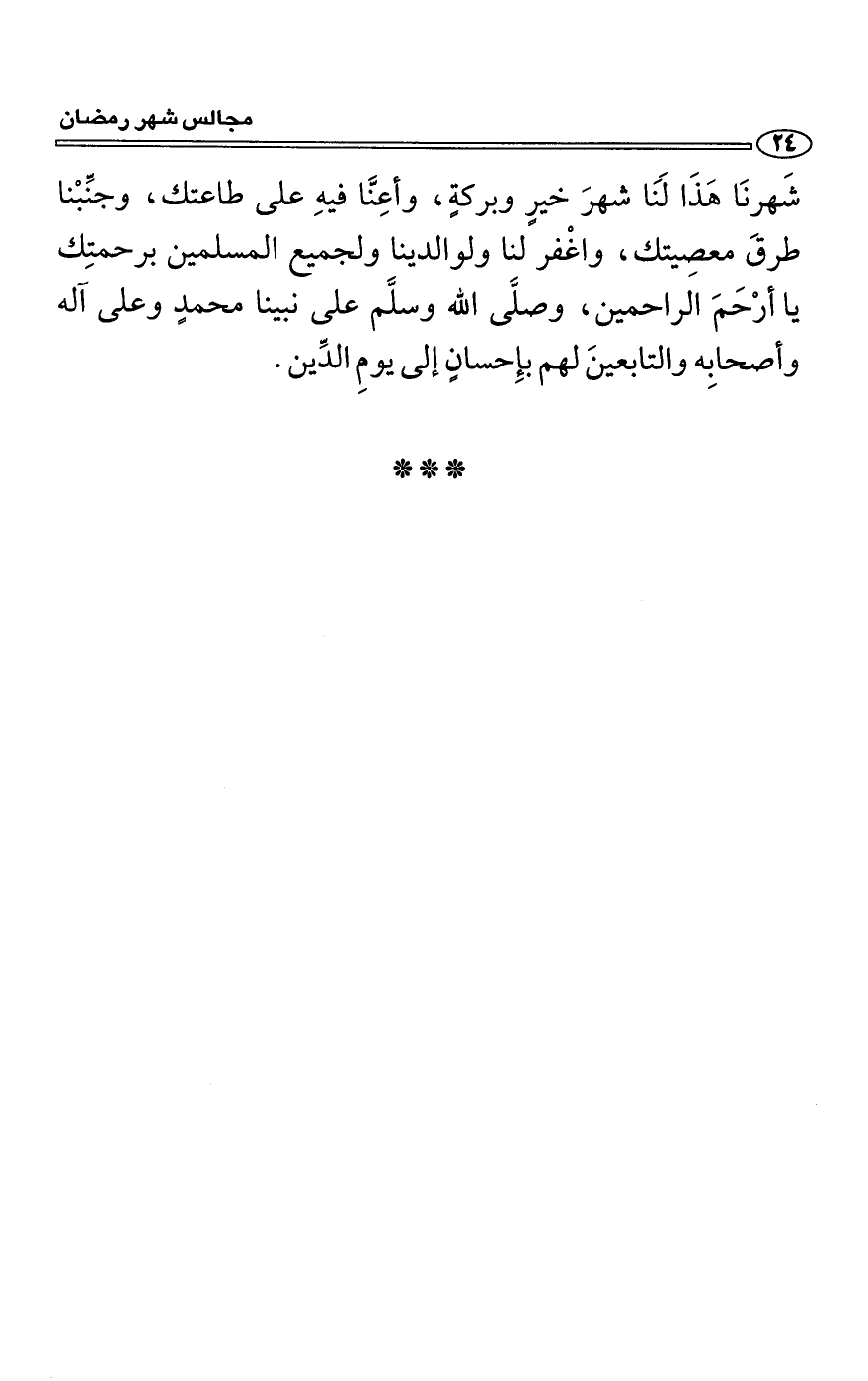 شَهرنَا هَذَا لَنَا شهرَ خيرٍ وبركةٍ، وأعِنَّا فيهِ على طاعتك، وجنِّبْنا طرقَ معصِيتك، واغْفر لنا ولوالدينا ولجميع المسلمين برحمتِك يا أرْحَمَ الراحمين، وصلَّى الله وسلَّم على نبينا محمدٍ وعلى آله وأصحابِه والتابعينَ لهم بإِحسانٍ إلى يومِ الدِّين.