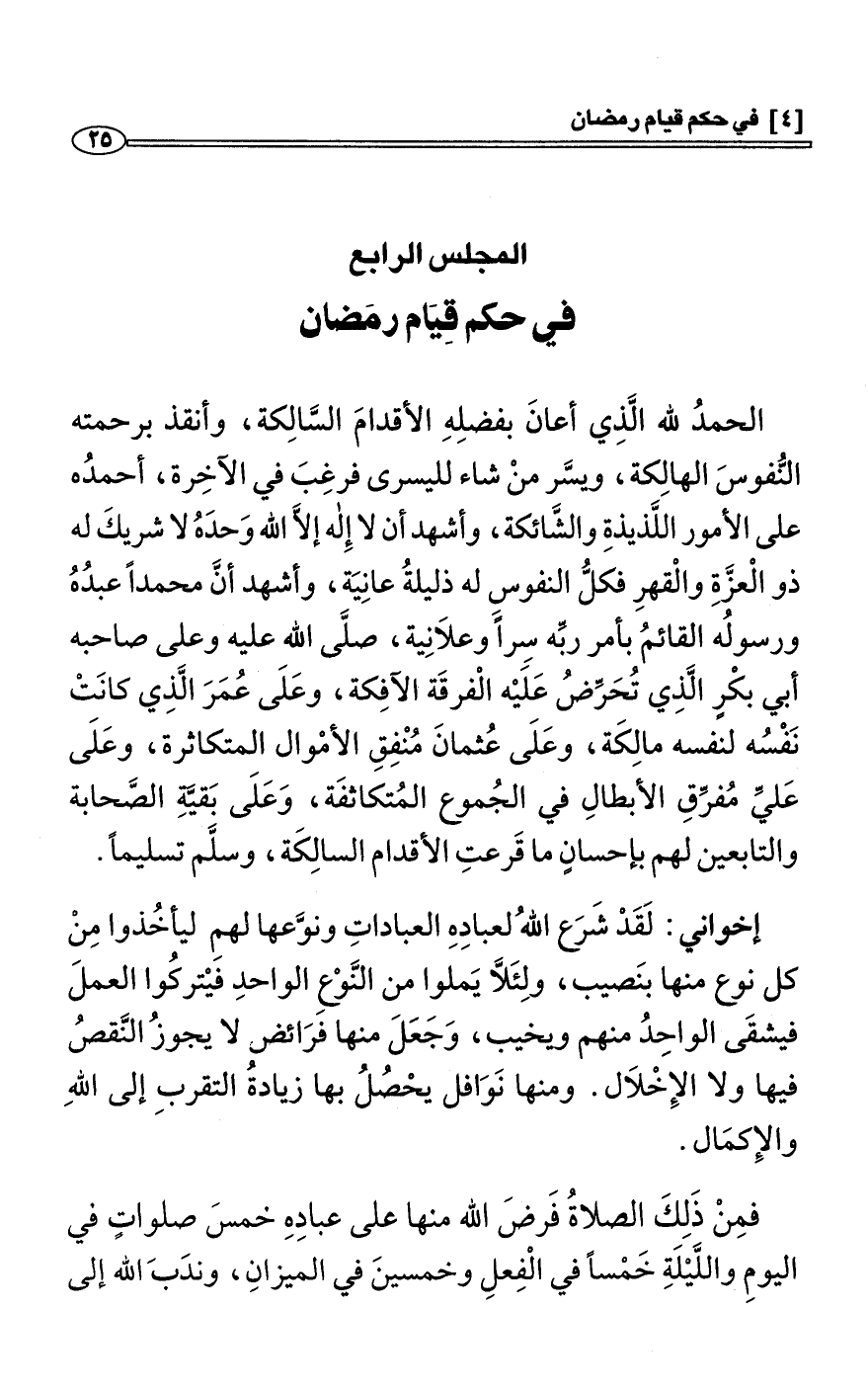 الحمدُ لله الَّذِي أعانَ بفضلِهِ الأقدامَ السَّالِكة، وأنقذ برحمته النُّفوسَ الهالِكة، ويسَّر منْ شاء لليسرى فرغِبَ في الآخِرة، أحمدُه على الأمور اللَّذيذةِ والشَّائكة، وأشهد أن لا إِله إلاَّ الله وَحدَهُ لا شريكَ له ذو الْعزَّةِ والْقهرِ فكلُّ النفوسِ له ذليلةٌ عانِيَة، وأشهد أنَّ محمداً عبدُهُ ورسولُه القائمُ بأمر ربِّه سِراً وعلاَنِية، صلَّى الله عليه وعلى صاحبه أبي بكْرٍ الَّذِي تُحَرِّضُ عَلَيْه الْفرقَة الآفِكة، وعَلَى عُمَرَ الَّذِي كانَتْ نَفْسُه لنفسه مالِكَة، وعَلَى عُثمانَ مُنْفِقِ الأمْوال المتكاثرة، وعَلَى عَليِّ مُفرِّقِ الأبطالِ في الجُموع المُتكاثفَة، وَعَلَى بَقيَّةِ الصَّحابة والتابعين لهم بإحسانٍ ما قَرعتِ الأقدام السالِكَة، وسلَّم تسليماً.