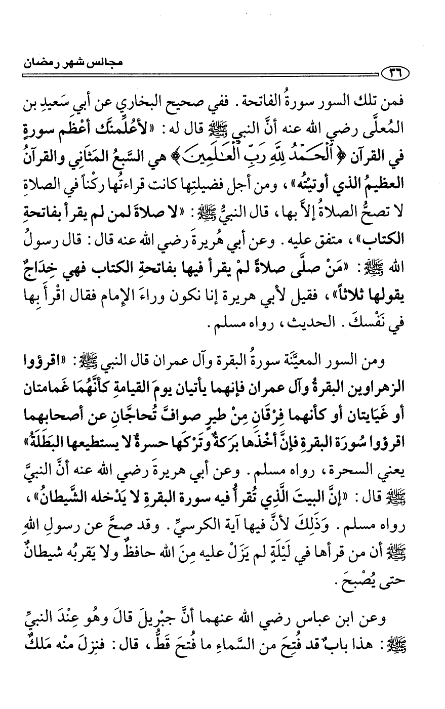 ومن السور المعيَّنَة سورةُ البقرة وآل عمران قال النبي صلى الله عليه وسلّم: «اقرؤوا الزهراوين البقرةُ وآل عمران فإنهما يأتيان يومَ القيامةِ كأنَّهُمَا غَمامتان أو غَيَايتان أو كأنهما فِرْقَانِ مِنْ طيرٍ صوافَّ تُحاجَّانِ عن أصحابهما اقرؤوا سُورَة البقرةِ فإنَّ أخْذَها بَرَكةٌ وتَرْكَها حسرةٌ لا يستطيعها البَطَلَةُ» يعني السحرة، رواه مسلم. وعن أبي هريرةَ رضي الله عنه أنَّ النبيَّ صلى الله عليه وسلّم قال: «إنَّ البيتَ الَّذِي تُقرأُ فيه سورة البقرةِ لا يَدْخله الشَّيطانُ»، رواه مسلم. وَذَلِكَ لأنَّ فيها آية الكرسيِّ. وقد صحَّ عن رسولِ اللهِ صلى الله عليه وسلّم أن من قرأها في لَيْلَةٍ لم يَزَلْ عليه مِنَ الله حافظٌ ولا يَقربُه شيطانٌ حتى يُصْبحَ.