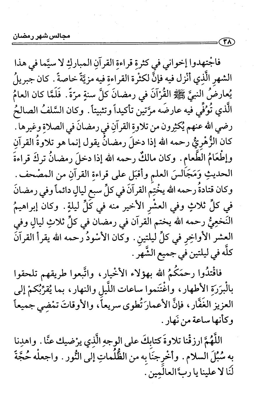 فاجْتهدوا إخواني في كثرةِ قراءةِ القرآنِ المباركِ لا سيَّما في هذا الشهرِ الَّذِي أنْزل فيه فإنَّ لكثْرة القراءةِ فيه مزيَّةً خاصةً. كان جبريلُ يُعارضُ النبيَّ صلى الله عليه وسلّم القُرْآنَ في رمضانَ كلَّ سنةٍ مرّةً. فَلَمَّا كان العامُ الَّذي تُوُفِّي فيه عارضَه مرَّتين تأكيداً وتثبيتاً. وكان السَّلفُ الصالحُ رضي الله عنهم يُكثِرون من تلاوةِ القرآنِ في رمضانَ في الصلاةِ وغيرها. كان الزُّهْرِيُّ رحمه الله إذا دخلَ رمضانُ يقول إنما هو تلاوةُ القرآنِ وإطْعَامُ الطَّعامِ. وكان مالكٌ رحمه الله إذا دخلَ رمضانُ تركَ قراءةَ الحديثِ وَمَجَالسَ العلمِ وأقبَل على قراءةِ القرآنِ من المصْحف. وكان قتادةُ رحمه الله يخْتِم القرآنَ في كلِّ سبعِ ليالٍ دائماً وفي رمضانَ في كلِّ ثلاثٍ وفي العشْرِ الأخير منه في كلِّ ليلةٍ. وكان إبراهيمُ النَخعِيُّ رحمه الله يختم القرآن في رمضان في كلِّ ثلاثِ ليالٍ وفي العشر الأواخِرِ في كلِّ ليلتينِ. وكان الأسْودُ رحمه الله يقرأ القرآنَ كلَّه في ليلتين في جميع الشَّهر.