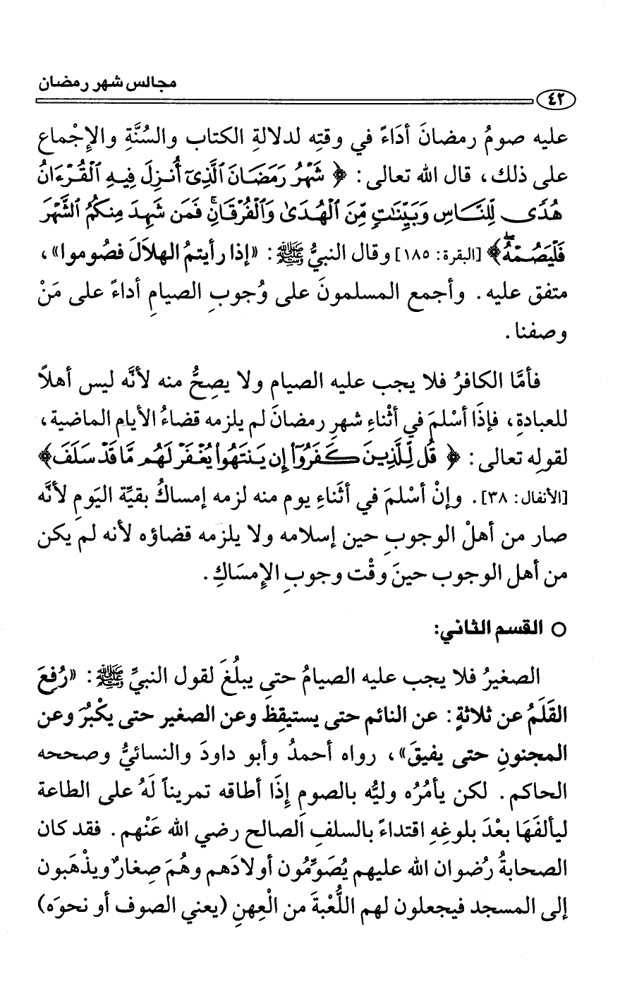فأمَّا الكافرُ فلا يجب عليه الصيام ولا يصِحُّ منه لأنَّه ليس أهلاً للعبادةِ، فإذَا أسْلمَ في أثْناءِ شهرِ رمضانَ لم يلزمه قضاءُ الأيام الماضية، لقولِه تعالى: {قُل لِلَّذِينَ كَفَرُواْ إِن يَنتَهُواْ يُغْفَرْ لَهُمْ مَّا قَدْ سَلَفَ} [الأنفال: 38]. وإنْ أسْلمَ في أثَناءِ يوم منه لزمه إمساكُ بقيِّة اليَومِ لأنَّه صار من أهلْ الوجوبِ حين إسلامه ولا يلزمه قضاؤه لأنه لم يكن من أهل الوجوب حينَ وقْت وجوبِ الإِمسَاكِ.