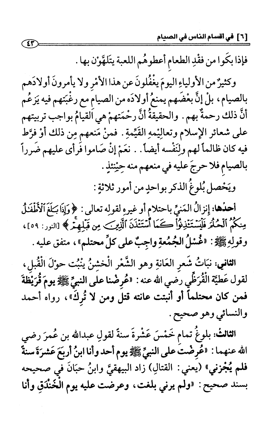 الثالثُ: بلوغُ تمامِ خَمْسَ عَشْرةَ سنةً لقولِ عبدالله بن عُمرَ رضي الله عنهما: «عُرِضْت على النبيِّ صلى الله عليه وسلّم يوم أحد وأنا ابنُ أربَعَ عَشرَةَ سنةً فلم يُجْزني» (يعني: القتالِ) زاد البيهقيَّ وابنُ حبَانَ في صحيحه بسند صحيح: «ولم يرني بلغت، وعرضت عليه يوم الْخَنْدَقِ وأنا