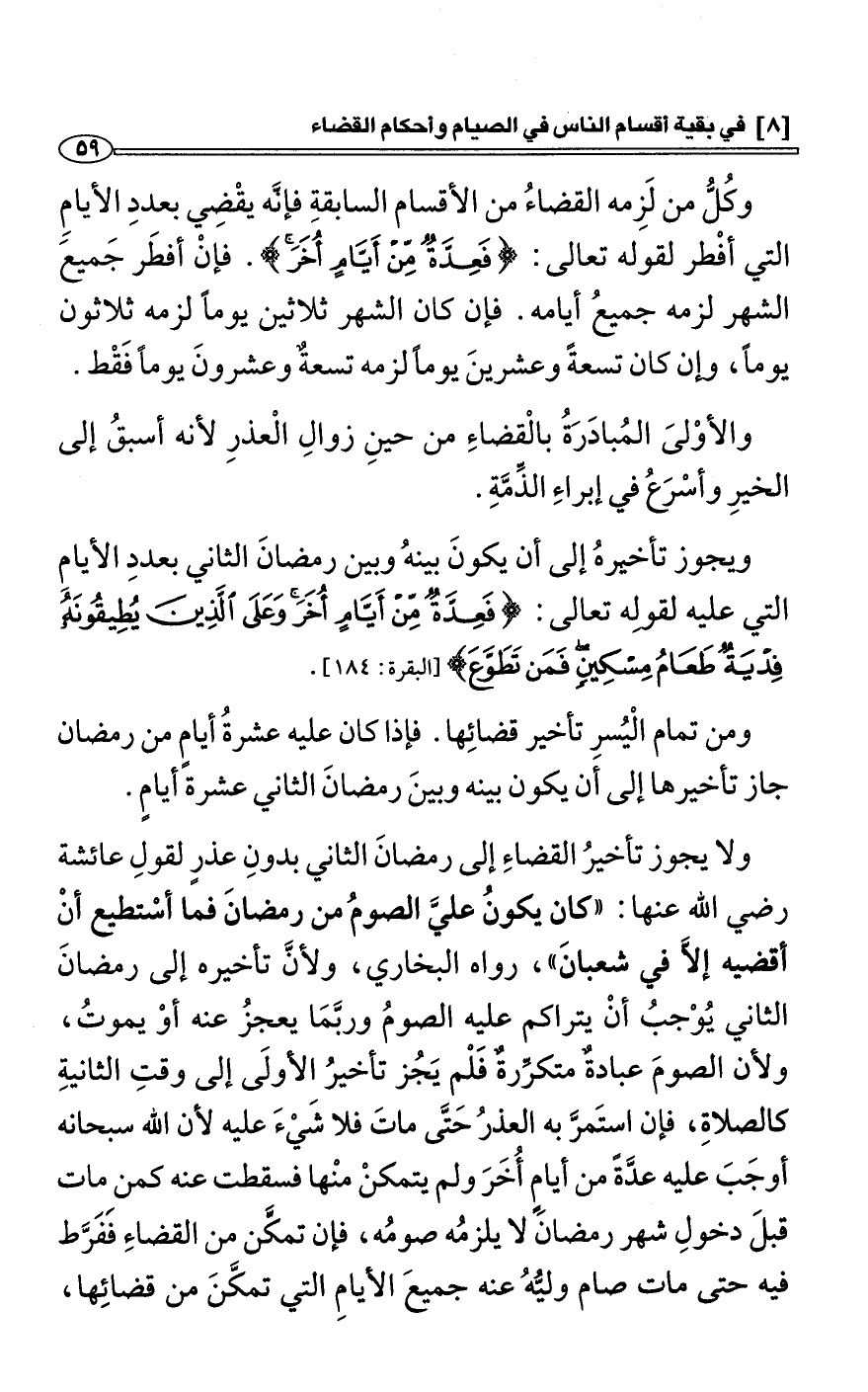 ويجوز تأخيرهُ إلى أن يكونَ بينهُ وبين رمضانَ الثاني بعددِ الأيامِ التي عليه لقولِه تعالى: {فَعِدَّةٌ مِّنْ أَيَّامٍ أُخَرَ وَعَلَى الَّذِينَ يُطِيقُونَهُ فِدْيَةٌ طَعَامُ مِسْكِينٍ فَمَن تَطَوَّعَ} [البقرة: 184].