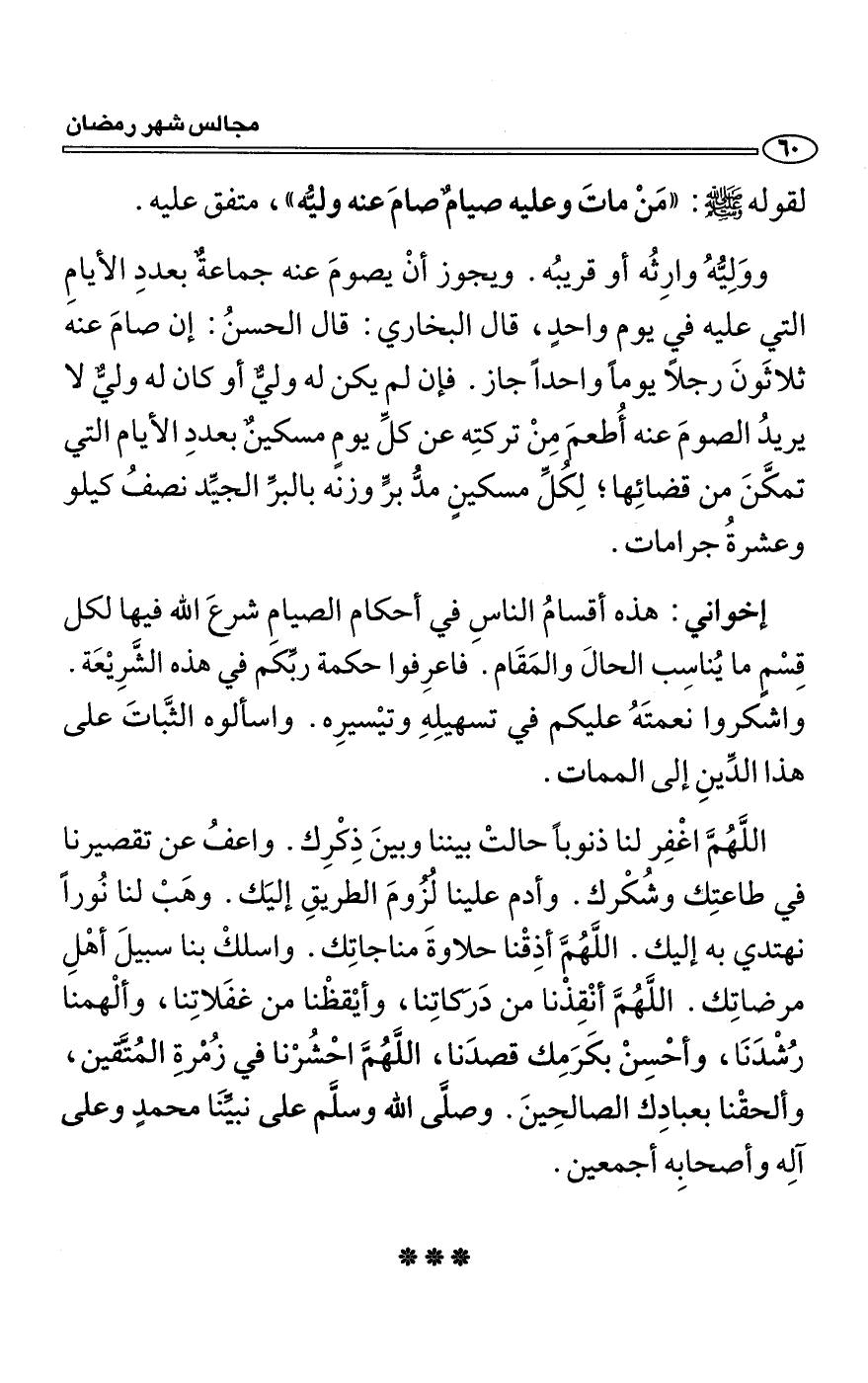 اللَّهُمَّ اغْفِر لنا ذنوباً حالتْ بيننا وبينَ ذِكْرِك. واعفُ عن تقصيرنا في طاعتِك وشُكْرك. وأدم علينا لُزُومَ الطريقِ إليَك. وهَبْ لنا نُوراً نهتدي به إليك. اللَّهُمَّ أذِقْنا حلاوةَ مناجاتِك. واسلكْ بنا سبيلَ أهْلِ مرضاتِك. اللَّهُمَّ أنْقِذْنا من دَرَكاتِنا، وأيْقظْنا من غفَلاتِنا، وألْهمنا رُشْدَنَا، وأحْسِنْ بكَرَمِك قصدَنا، اللَّهُمَّ احْشُرْنا في زُمْرةِ المُتَّقين، وألحقْنا بعبادِك الصالحِينَ. وصلَّى الله وسلَّم على نبيِّنَا محمدٍ وعلى آلِه وأصحابِه أجمعين.