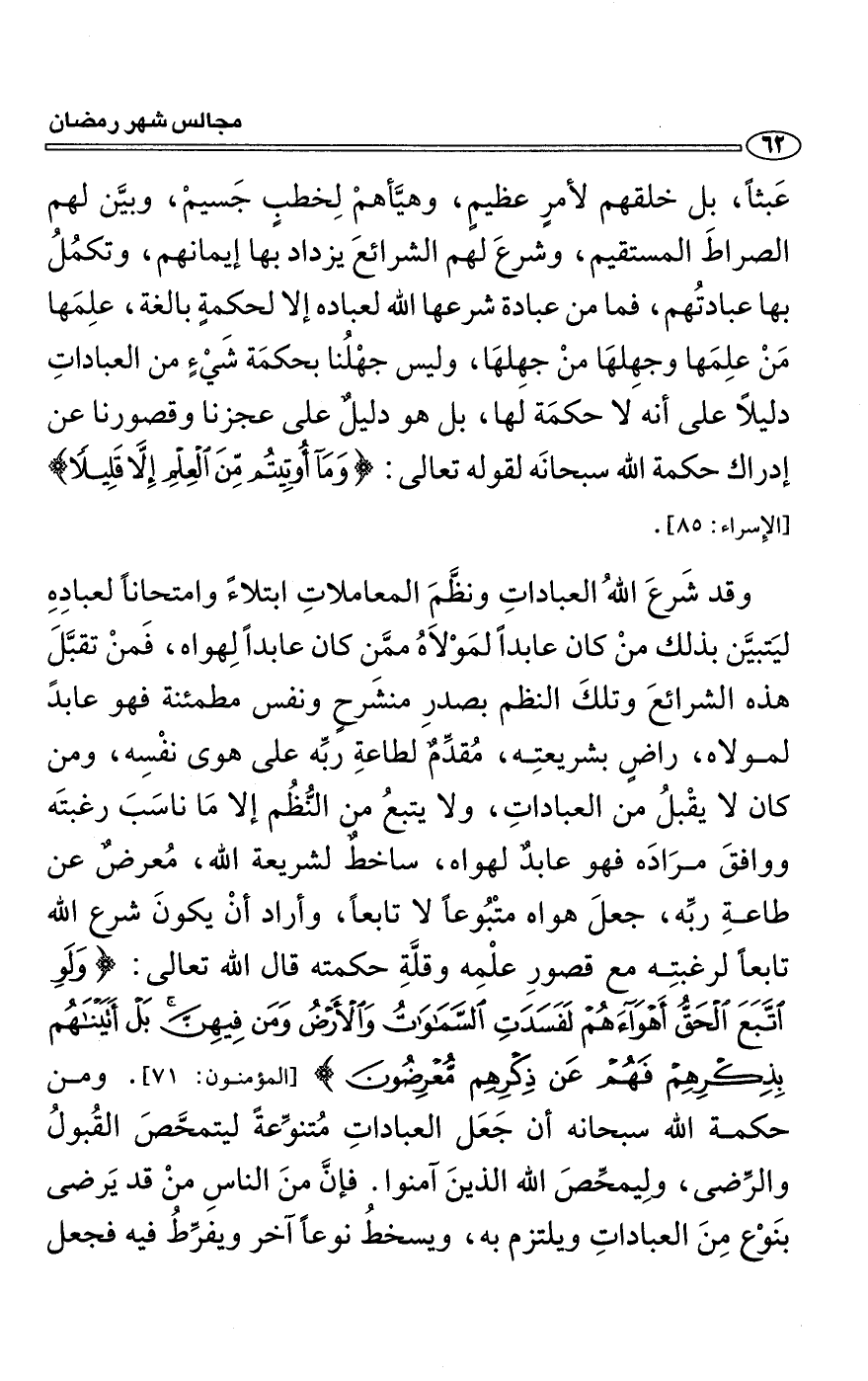 عبثاً، بل خلقهم لأمرٍ عظيمٍ، وهيَّأهمْ لِخطبٍ جَسيمْ، وبيَّن لهم الصراطَ المستقيم، وشرعَ لهم الشرائعَ يزداد بها إيمانهم، وتكمُلُ بها عبادتُهم، فما من عبادة شرعها الله لعباده إلا لحكمةٍ بالغة، علِمَها مَنْ علِمَها وجهِلهَا منْ جهِلهَا، وليس جهْلُنا بحكمَة شَيْءٍ من العباداتِ دليلاً على أنه لا حكمَة لها، بل هو دليلٌ على عجزنا وقصورنا عن إدراك حكمة الله سبحانَه لقوله تعالى: {وَمَآ أُوتِيتُم مِّن الْعِلْمِ إِلاَّ قَلِيلاً} [الإِسراء: 85].