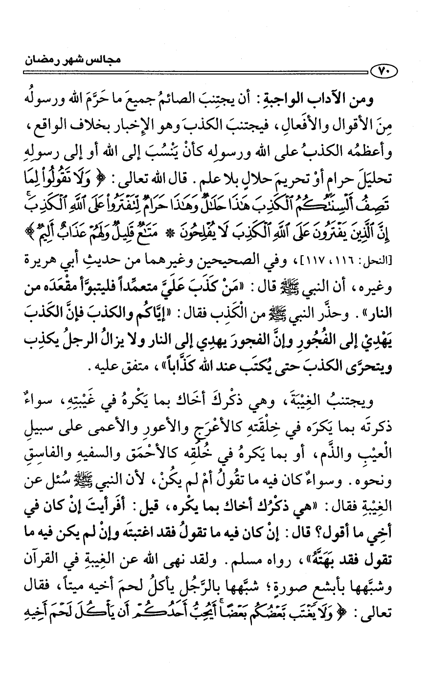 ومن الآداب الواجبةِ: أن يجتِنبَ الصائمُ جميعَ ما حَرَّمَ الله ورسولُه مِنَ الأقوال والأفَعالِ، فيجتنبَ الكذبَ وهو الإِخبار بخلاف الواقع، وأعظمُه الكذبُ على الله ورسولِه كأنْ يَنْسُبَ إلى الله أو إلى رسولِهِ تحليَلَ حرامٍ أوْ تحريمَ حلالٍ بلا علم. قال الله تعالى: {وَلاَ تَقُولُواْ لِمَا تَصِفُ أَلْسِنَتُكُمُ الْكَذِبَ هَذَا حَلَلٌ وَهَذَا حَرَامٌ لِّتَفْتَرُواْ عَلَى اللَّهِ الْكَذِبَ إِنَّ الَّذِينَ يَفْتَرُونَ عَلَى اللَّهِ الْكَذِبَ لاَ يُفْلِحُونَ * مَتَعٌ قَلِيلٌ وَلَهُمْ عَذَابٌ أَلِيمٌ} [النحل: 116، 117]، وفي الصحيحين وغيرهما من حديثِ أبي هريرة وغيره، أن النبي صلى الله عليه وسلّم قال: «مَنْ كَذَبَ عَلَيَّ متعمِّداً فليتبوَّأ مقْعَدَه من النار». وحذَّر النبي صلى الله عليه وسلّم من الْكَذِب فقال: «إيَّاكُم والكذبَ فإنَّ الكَذبَ يَهْدِيْ إلى الفُجُورِ وإنَّ الفجورَ يهدِي إلى النار ولا يزالُ الرجلُ يكذِب ويتحرَّى الكذبَ حتى يُكتَب عند الله كَذَّاباً»، متفق عليه.