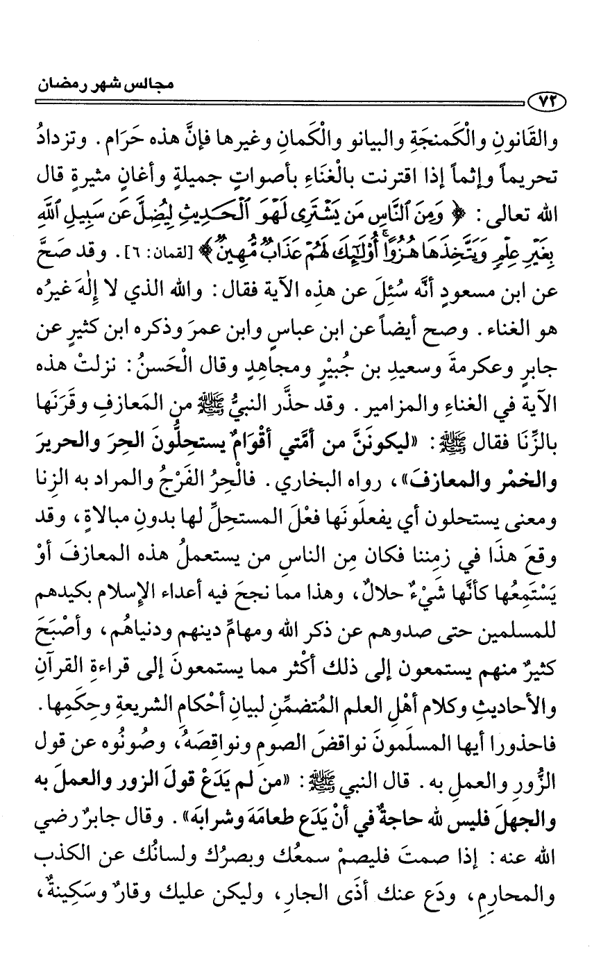 والقَانونِ والْكَمنجَةِ والبيانو والْكَمانِ وغيرها فإنَّ هذه حَرَام. وتزدادُ تحريماً وإثماً إذا اقترنت بالْغنَاءِ بأصواتٍ جميلةٍ وأغانٍ مثيرةٍ قال الله تعالى: {وَمِنَ النَّاسِ مَن يَشْتَرِى لَهْوَ الْحَدِيثِ لِيُضِلَّ عَن سَبِيلِ اللَّهِ بِغَيْرِ عِلْمٍ وَيَتَّخِذَهَا هُزُواً أُوْلَئِكَ لَهُمْ عَذَابٌ مُّهِينٌ} [لقمان: 6]. وقد صَحَّ عن ابن مسعودٍ أنَّه سُئِلَ عن هذِه الآية فقال: والله الذي لا إِلهَ غيرُه هو الغناء. وصح أيضاً عن ابن عباسٍ وابن عمرَ وذكره ابن كثيرٍ عن جابرٍ وعكرمةَ وسعيدِ بن جُبيْرٍ ومجاهِدٍ وقال الْحَسنُ: نزلتْ هذه الاية في الغناءِ والمزامير. وقد حذَّر النبيُّ صلى الله عليه وسلّم من المَعازفِ وقَرَنَها بالزِّنَا فقال صلى الله عليه وسلّم: «ليكونَنَّ من أمَّتي أقْوَامٌ يستحِلُّونَ الحِرَ والحريرَ والخمْر والمعازفَ»، رواه البخاري. فالْحِرُ الفَرْجُ والمراد به الزِنا ومعنى يستحلون أي يفعلَونَها فعْلَ المستحِلِّ لها بدونِ مبالاةٍ، وقد وقعَ هذَا في زمِننا فكان مِن الناسِ من يستعملُ هذه المعازفَ أوْ يَسْتَمِعُها كأنَّها شَيْءٌ حلالٌ، وهذا مما نجحَ فيه أعداء الإِسلام بكيدهم للمسلمين حتى صدوهم عن ذكر الله ومهامِّ دينهم ودنياهُم، وأصْبَحَ كثيرٌ منهم يستمعون إلى ذلك أكْثر مما يستمعونَ إلى قراءةِ القرآنِ والأحاديثِ وكلام أهْلِ العلم المُتضمِّنِ لبيانِ أحْكامِ الشريعةِ وحِكَمِها. فاحذورا أيها المسلَمونَ نواقضَ الصومِ ونواقِصَهُ، وصُونُوه عن قول الزُّورِ والعملِ به. قال النبي صلى الله عليه وسلّم: «من لم يَدَعْ قولَ الزور والعملَ به والجهلَ فليس لله حاجةٌ في أنْ يَدَع طعامَهَ وشرابَه». وقال جابرٌ رضي الله عنه: إذا صمتَ فليصمْ سمعُك وبصرُك ولسانُك عن الكذب والمحارِمِ، ودَع عنك أذَى الجارِ، وليكن عليك وقارٌ وسَكِينةٌ،