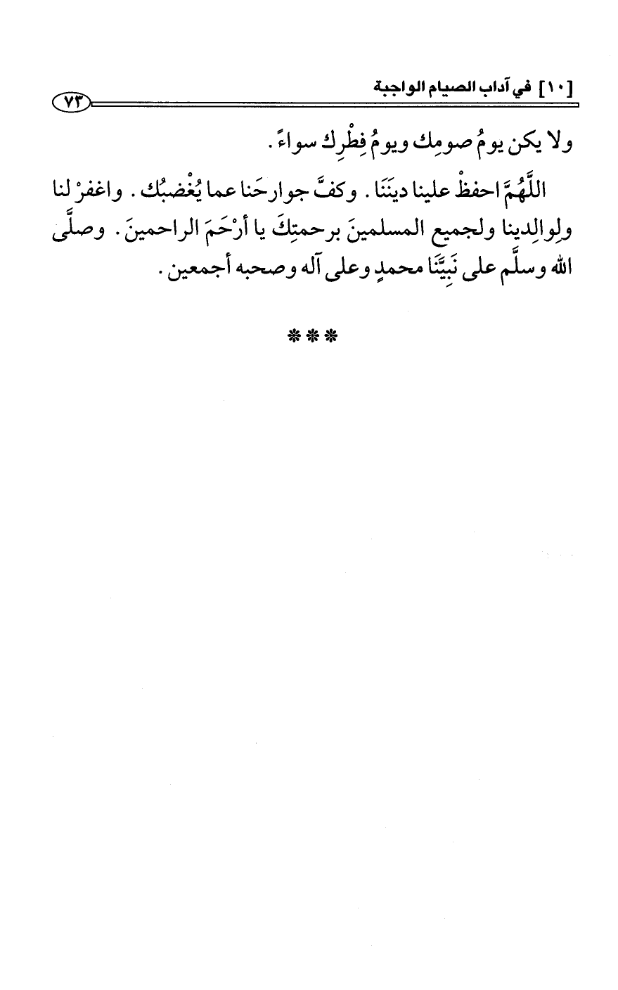 اللَّهُمَّ احفظْ علينا دينَنَا. وكفَّ جوارحَنا عما يُغْضبُك. واغفرْ لنا ولِوالِدينا ولجميع المسلمينَ برحمتِكَ يا أرْحَمَ الراحمينَ. وصلَّى الله وسلَّم على نَبِيَّنَا محمدٍ وعلى آله وصحبه أجمعين.