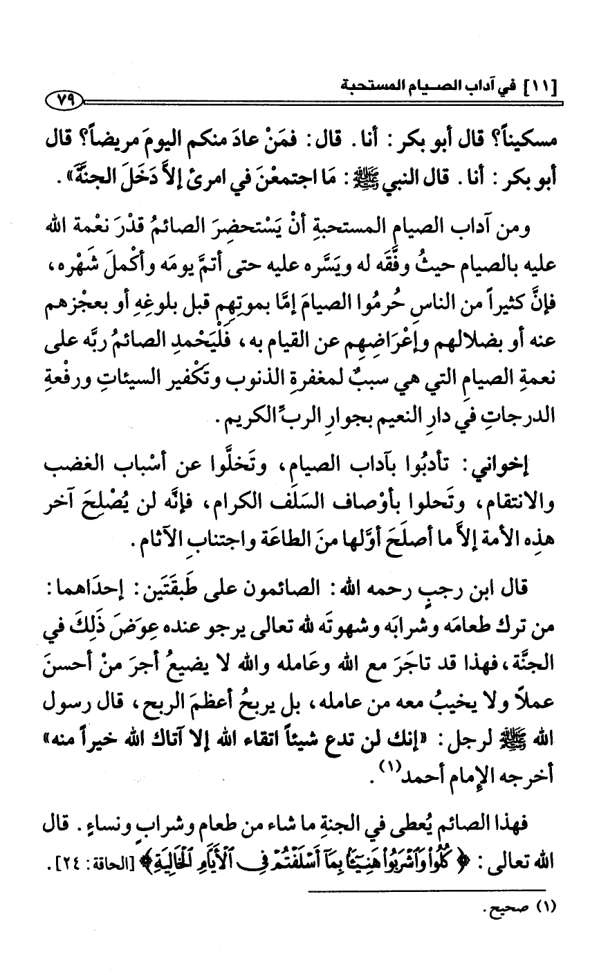 قال ابن رجبٍ رحمه الله: الصائمون على طَبقَتَين: إحدَاهما: من ترك طعامَه وشرابَه وشهوتَه لله تعالى يرجو عنده عِوَضَ ذَلِكَ في الجنَّة، فهذا قد تاجَرَ مع الله وعَامله والله لا يضيعُ أجرَ منْ أحسنَ عملاً ولا يخيبُ معه من عامله، بل يربحُ أعظمَ الربح، قال رسول الله صلى الله عليه وسلّم لرجل: «إنك لن تدع شيئاً اتقاء الله إلا آتاك الله خيراً منه» أخرجه الإِمام أحمد. (¬1) فهذا الصائم يُعطى في الجنةِ ما شاء من طعام وشرابٍ ونساءٍ. قال الله تعالى: {كُلُواْ وَاشْرَبُواْ هَنِيئَاً بِمَا أَسْلَفْتُمْ فِى الأَيَّامِ الْخَالِيَةِ} [الحاقة: 24].