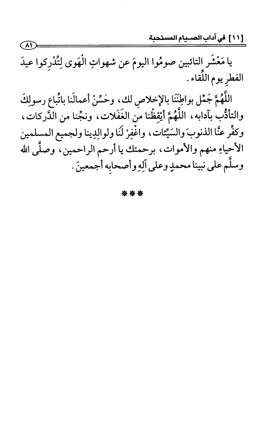 اللَّهُمَّ جَمِّل بواطِنَنَا بالإِخلاصِ لك، وحَسِّنْ أعمالَنا باتِّباع رسولِكَ والتأدُّب بآدابه، اللَّهُمَّ أيْقِظْنا من الغَفَلات، ونجِّنا من الدَّركات، وكفِّر عنَّا الذنوبَ والسَيِّئات، واغْفِرْ لَنَا ولوالِدِينا ولجميع المسلمين الأحياءِ منهم والأموات، برحمتك يا أرحم الراحمين، وصلَّى الله وسلَّم على نبينا محمدٍ وعلى آلِهِ وأصحابِه أجمعينَ.