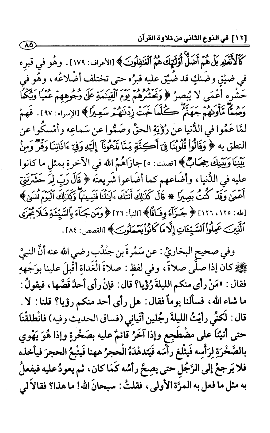 وفي صحيح البخاريِّ: عن سَمُرةَ بن جنْدُب رضي الله عنه أنَّ النبيَّ صلى الله عليه وسلّم كان إذا صلَّى صلاةً، وفي لفظٍ: صلاةَ الْغَداةِ أقْبلَ علينا بوَجْههِ فقال: «مَنْ رأى منكم الليلةَ رُؤْيا؟ قال: فإنْ رأى أحدٌ قَصَّها، فيقولُ: ما شاء الله، فسألنا يوماً فقال: هل رأى أحد منكم رؤيا؟ قلنا: لا. قال: لَكنِّي رأيْتُ الليلةَ رجُلين أتَيانِي (فساق الحديث وفيه) فانْطلقْنَا حتى أتيْنَا على مضْطَجِعٍ وإذا آخَرُ قائمٌ عليه بصَخْرةٍ وإذا هُوَ يَهْوي بالصَّخْرَةِ لِرَأْسِه فَيثْلغ رأسَه فَيَتدهْدَهُ الْحجرُ ههنا فَيتْبعُ الحجرَ فيأخذه فلا يَرجعُ إلى الرَّجُلِ حتى يصِحَّ رأسُه كَمَا كان، ثم يعودُ عليه فيفعلُ به مثل ما فعل به المرَّة الأولى، فقلتُ: سبحانَ الله! ما هذا؟ فقالاَ لي