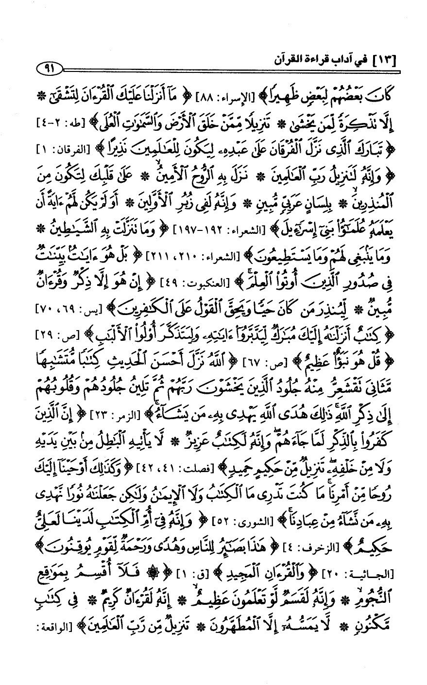 كَانَ بَعْضُهُمْ لِبَعْضٍ ظَهِيرًا} [الإِسراء: 88] {مَآ أَنَزَلْنَا عَلَيْكَ الْقُرْءَانَ لِتَشْقَى * إِلاَّ تَذْكِرَةً لِّمَن يَخْشَى * تَنزِيلاً مِّمَّنْ خَلَق الأَرْضَ وَالسَّمَاوَتِ الْعُلَى} [طه: 2 - 4] {تَبَارَكَ الَّذِى نَزَّلَ الْفُرْقَانَ عَلَى عَبْدِهِ لِيَكُونَ لِلْعَالَمِينَ نَذِيراً} [الفرقان: 1] {وَإِنَّهُ لَتَنزِيلُ رَبِّ الْعَلَمِينَ * نَزَلَ بِهِ الرُّوحُ الأَمِينُ * عَلَى قَلْبِكَ لِتَكُونَ مِنَ الْمُنْذِرِينَ * بِلِسَانٍ عَرَبِىٍّ مُّبِينٍ * وَإِنَّهُ لَفِى زُبُرِ الأَوَّلِينَ * أَوَ لَمْ يَكُن لَّهُمْءَايَةً أَن يَعْلَمَهُ عُلَمَاءُ بَنِى إِسْرَءِيلَ} [الشعراء: 192 - 197] {وَمَا تَنَزَّلَتْ بِهِ الشَّيَاطِينُ * وَمَا يَنبَغِى لَهُمْ وَمَا يَسْتَطِيعُونَ} [الشعراء: 210، 211] {بَلْ هُوَءَايَاتٌ بَيِّنَاتٌ فِى صُدُورِ الَّذِينَ أُوتُواْ الْعِلْمَ} [العنكبوت: 49] {إِنْ هُوَ إِلاَّ ذِكْرٌ وَقُرْءَانٌ مُّبِينٌ * لِّيُنذِرَ مَن كَانَ حَيّاً وَيَحِقَّ الْقَوْلُ عَلَى الْكَافِرِينَ} [يس: 69، 70] {كِتَابٌ أَنزَلْنَاهُ إِلَيْكَ مُبَارَكٌ لِّيَدَّبَّرُواْءَايَاتِهِ وَلِيَتَذَكَّرَ أُوْلُو الأَلْبَابِ} [ص: 29] {قُلْ هُوَ نَبَأٌ عَظِيمٌ} [ص: 67] {اللَّهُ نَزَّلَ أَحْسَنَ الْحَدِيثِ كِتَاباً مُّتَشَابِهاً مَّثَانِيَ تَقْشَعِرُّ مِنْهُ جُلُودُ الَّذِينَ يَخْشَوْنَ رَبَّهُمْ ثُمَّ تَلِينُ جُلُودُهُمْ وَقُلُوبُهُمْ إِلَى ذِكْرِ اللَّهِ ذَلِكَ هُدَى اللَّهِ يَهْدِى بِهِ مَن يَشَآءُ وَمَن يُضْلِلِ اللَّهُ فَمَا لَهُ مِنْ هَادٍ} [الزمر: 23] {إِنَّ الَّذِينَ كَفَرُواْ بِالذِّكْرِ لَمَّا جَآءَهُمْ وَإِنَّهُ لَكِتَابٌ عَزِيزٌ * لاَّ يَأْتِيهِ الْبَاطِلُ مِن بَيْنِ يَدَيْهِ وَلاَ مِنْ خَلْفِهِ تَنزِيلٌ مِّنْ حَكِيمٍ حَمِيدٍ} [فصلت: 41، 42] {وَكَذَلِكَ أَوْحَيْنَآ إِلَيْكَ رُوحاً مِّنْ أَمْرِنَا مَا كُنتَ تَدْرِى مَا الْكِتَابُ وَلاَ الإِيمَانُ وَلَكِن جَعَلْنَاهُ نُوراً نَّهْدِى بِهِ مَن نَّشَآءُ مِنْ عِبَادِنَا} [الشورى: 52] {وَإِنَّهُ فِى أُمِّ الْكِتَبِ لَدَيْنَا لَعَلِىٌّ حَكِيمٌ} [الزخرف: 4] {هَذَا بَصَائِرُ لِلنَّاسِ وَهُدًى وَرَحْمَةً لِّقَوْمٍ يُوقِنُونَ} [الجاثية: 20] {وَالْقُرْءَانِ الْمَجِيدِ} [ق: 1] {فَلاَ أُقْسِمُ بِمَوَقِعِ النُّجُومِ * وَإِنَّهُ لَقَسَمٌ لَّوْ تَعْلَمُونَ عَظِيمٌ * إِنَّهُ لَقُرْءَانٌ كَرِيمٌ * فِى كِتَابٍ مَّكْنُونٍ * لاَّ يَمَسُّهُ إِلاَّ الْمُطَهَّرُونَ * تَنزِيلٌ مِّن رَّبِّ الْعَالَمِينَ} [الواقعة: 75 - 80]