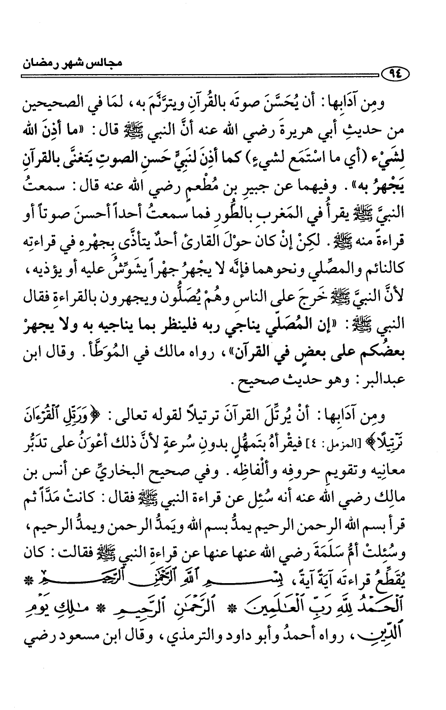 ومِن آدَابِها: أنْ يُرتِّلَ القرآنَ ترتيلاً لقوله تعالى: {وَرَتِّلِ الْقُرْءَانَ تَرْتِيلاً} [المزمل: 4] فيقْرأهُ بتَمهُّلٍ بدونِ سُرعةٍ لأنَّ ذلك أعْوَنُ على تدَبُّر معانِيه وتقويمِ حروفِه وألْفاظِه. وفي صحيح البخاريِّ عن أنس بن مالِك رضي الله عنه أنه سُئِل عن قراءة النبي صلى الله عليه وسلّم فقال: كانتْ مَدَّاً ثم قرأ بسم الله الرحمن الرحيم يمدُّ بسم الله ويَمدُّ الرحمن ويمدُّ الرحيم، وسُئِلتْ أمُّ سَلَمَةَ رضي الله عنها عنها عن قراءةِ النبي صلى الله عليه وسلّم فقالت: كان يُقَطِّعُ قراءتَه آيَةً آيةً، بِسْمِ اللَّهِ الرَّحْمَنِ الرَّحِيمِ * الْحَمْدُ للَّهِ رَبِّ الْعَالَمِينَ * الرَّحْمَنِ الرَّحِيمِ الرَّحِيمِ * مَالِكِ يَوْمِ الدِّينِ، رواه أحمدُ وأبو داود والترمذي، وقال ابن مسعود رضي