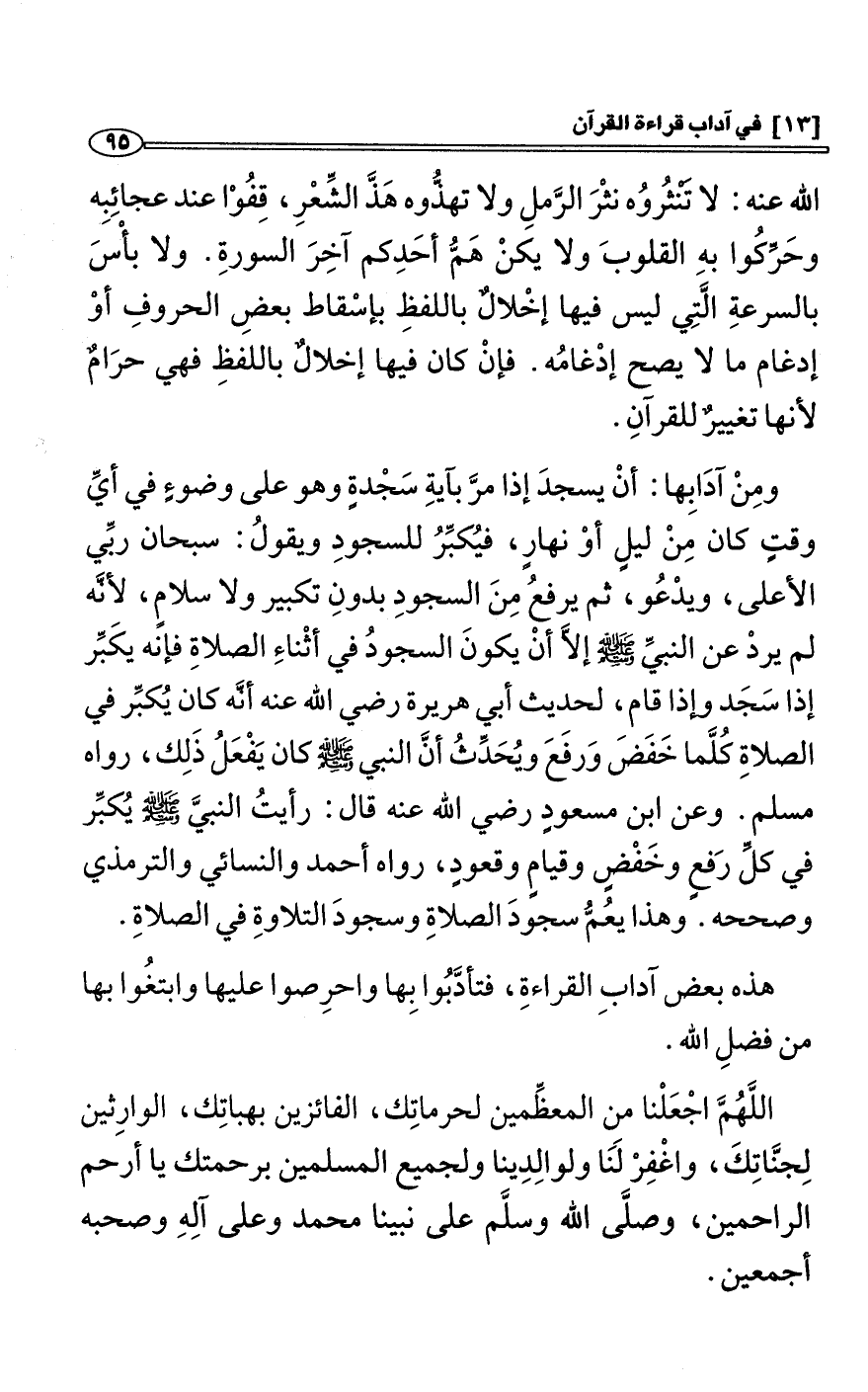 الله عنه: لا تَنْثُروُه نثْرَ الرَّملِ ولا تهذُّوه هَذَّ الشِّعْرِ، قِفُوْا عند عجائِبِه وحَرِّكُوا بهِ القلوبَ ولا يكنْ هَمُّ أحَدِكم آخِرَ السورةِ. ولا بأْسَ بالسرعةِ الَّتِي ليس فيها إخْلالٌ باللفظِ بإسْقاط بعضِ الحروفِ أوْ إدغام ما لا يصح إدْغامُه. فإنْ كان فيها إخلالٌ باللفظِ فهي حرَامٌ لأنها تغييرٌ للقرآنِ.